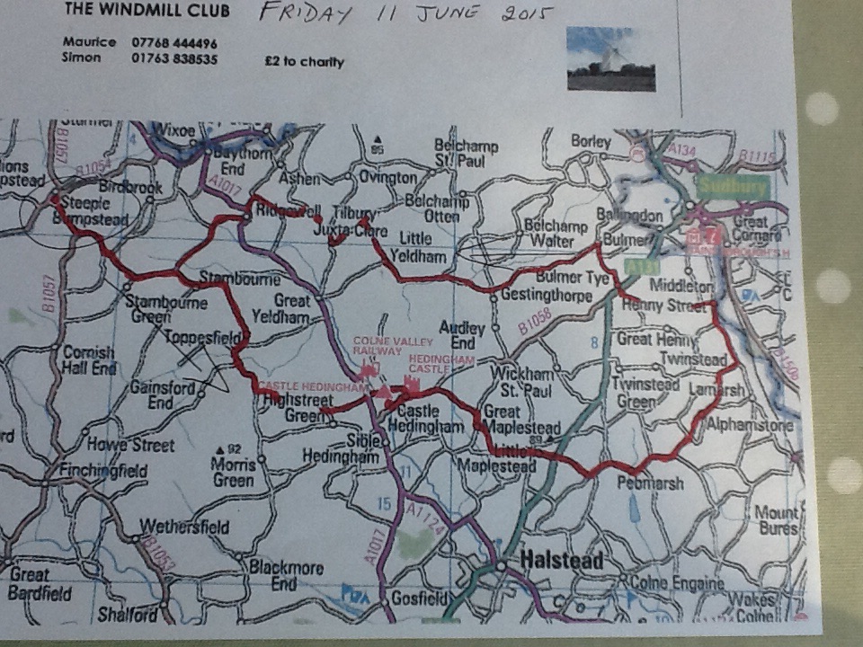 This was another glorious ride of 44 miles on a perfect summer’s day wending our way through Essex lanes. Starting from the Fox and Hounds in Steeple Bumpstead we stopped for coffee and cake in Castle Hedingham and then proceeded to Henny Street in Constable country for lunch by the river and much needed cold beers. A tail wind got us back to Steeple Bumpstead somewhat faster than on the outward stretch. Other than experiencing a violent domestic argument between two people in Sible Hedingham it was an uneventful trip. It was good to meet up with Kell Ryan at the end. Thanks, Maurice, for organising the ride. You are forgiven for only getting us lost once.