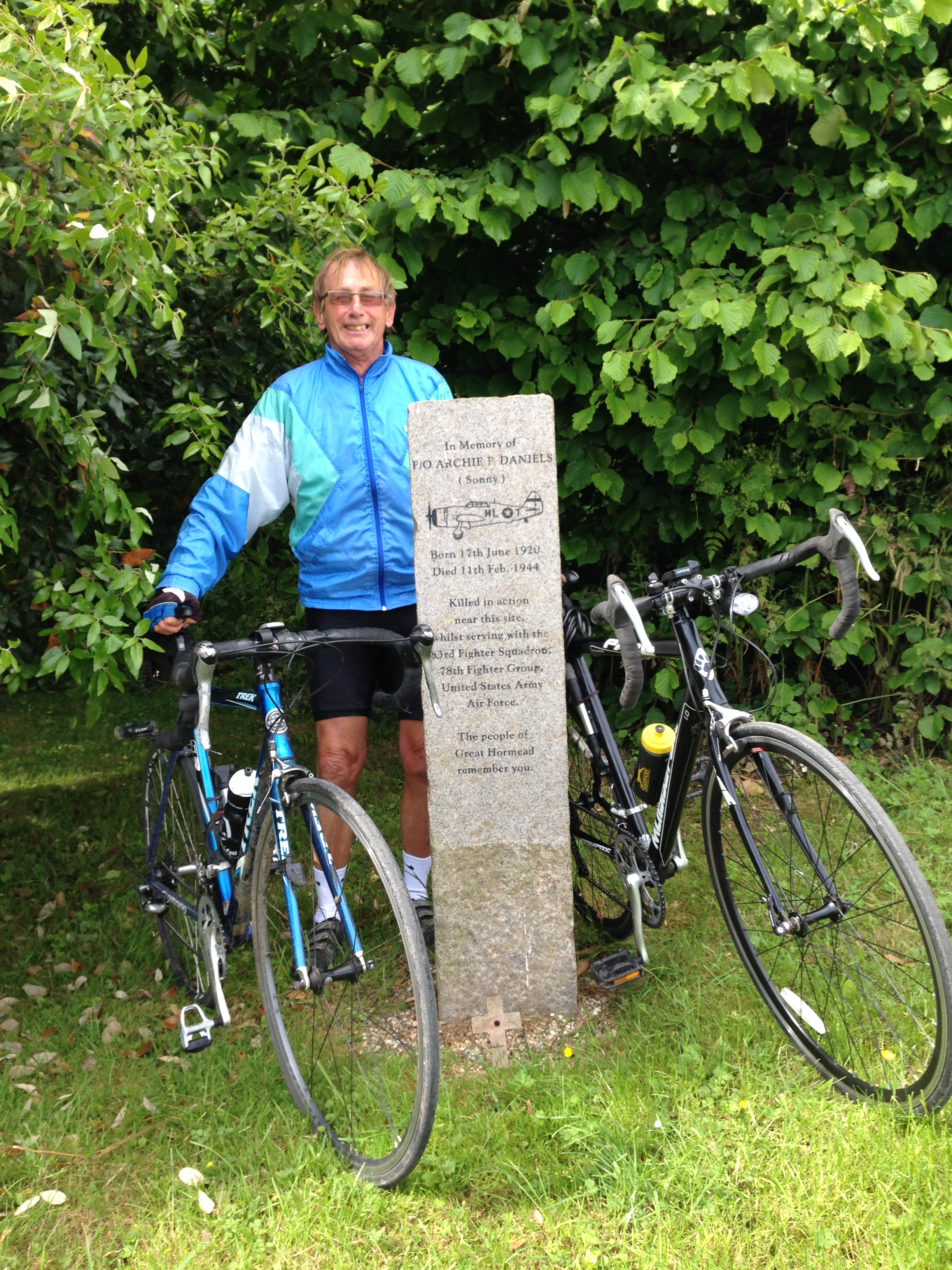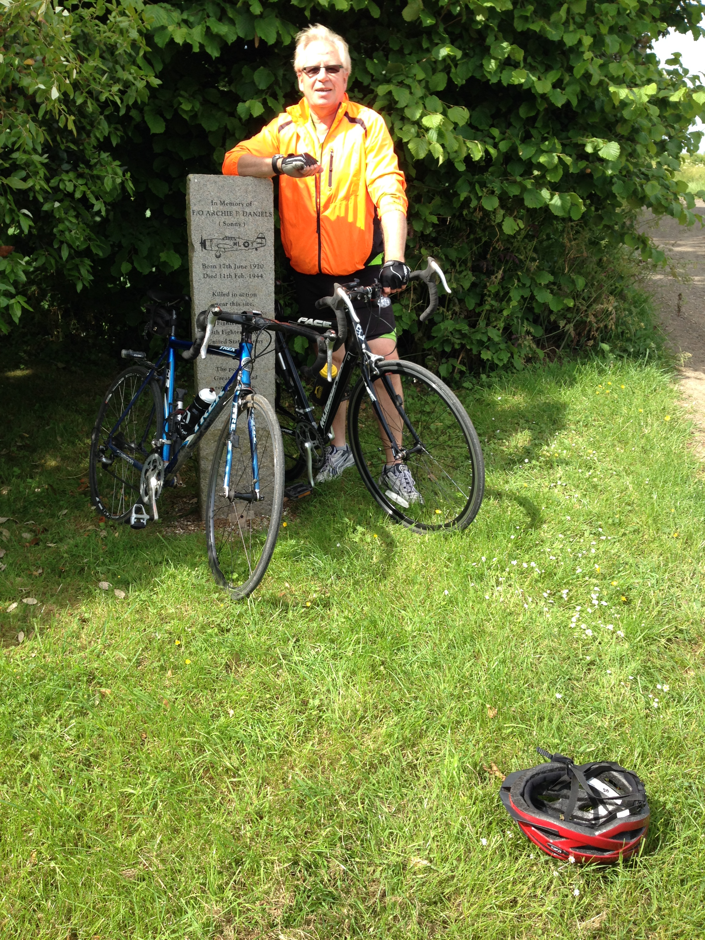 Numbers depleted to two riders today – John T and Andrew R completed a Barley- Barkway- Great Hormead- Brent Pelham- Clavering Lakes circuit with a photo stop at the memorial to F/O Archie F. Daniels Flying with the 83rd Fighter Squadron who crashed his P-47D just after takeoff.