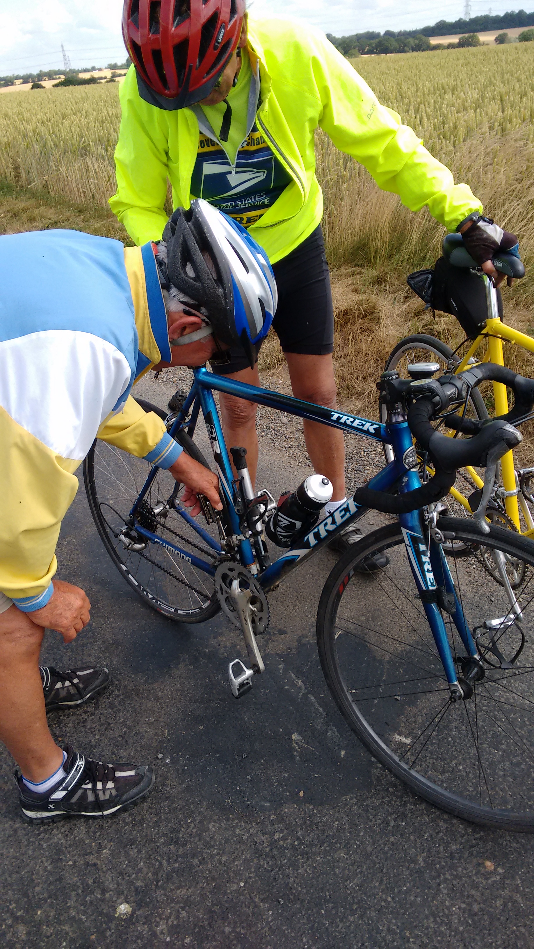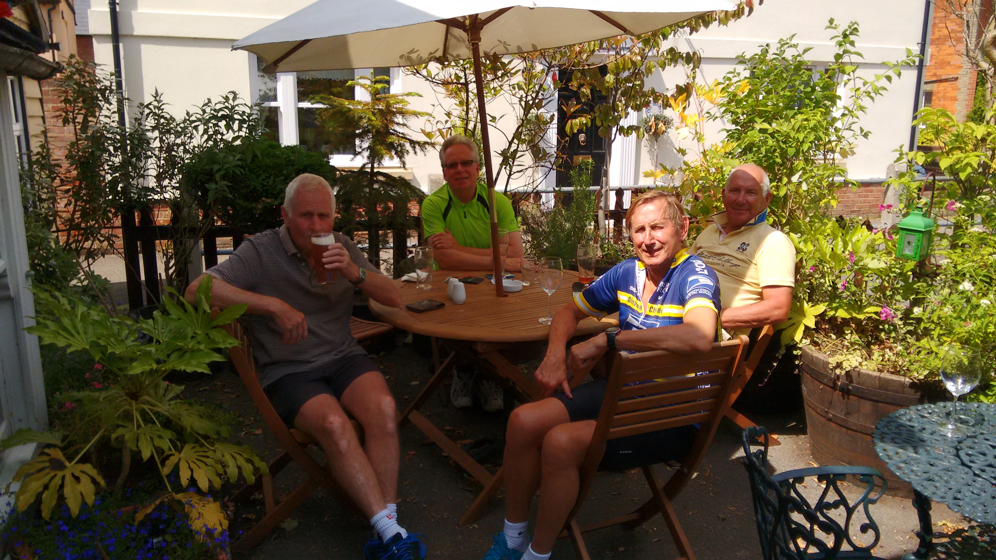 Today’s ride took five of us around quiet Essex lanes on a glorious day, stopping for coffee and cakes at our favourite haunt in Castle Hedingham, where there were no volunteers to have their bike padlocked to Martin Woodhead’s bike in case he again forgot to bring a key, as happened last year. However, we were not incident free due to John T’s chain coming off at frequent intervals which even our back up mechanic by the name of Maurice was unable to fix. Despite this, we moved along at quite a pace and arrived back at the Fox and Hounds by 1.15pm, well in time for a really excellent lunch. Other than millions of little black bugs which seemed particularly attracted to Andrew’s yellow day-glo vest, or it could simply have been because they knew he was Scottish, it was a perfect day’s ride.