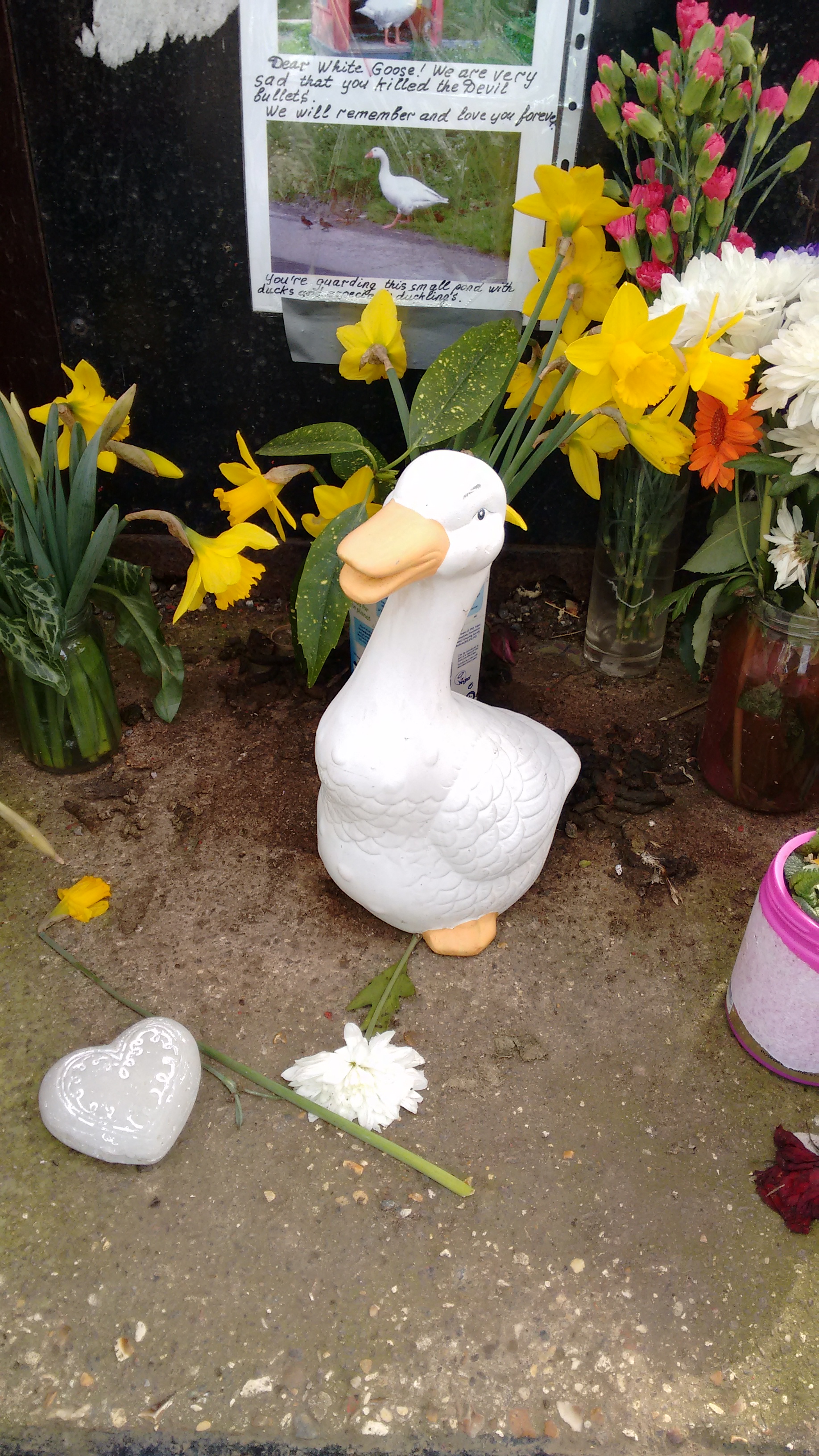 In Sandon we paid our respects to the village goose which was allegedly shot dead in February by an evil gang. According to one newspaper report: 26 Feb 2016 – A village is in mourning after a goose was killed in a drive-by shooting.The animal, simply known as The Goose, was slain with an air rifle by a gang in what sounds like the most British thing ever. It happened in the tiny village of Sandon in Hertfordshire, and residents are sure …. . And the Daily Mail said a reward of £27,500 had been offered to catch the criminals but, on the other hand, other reports said: