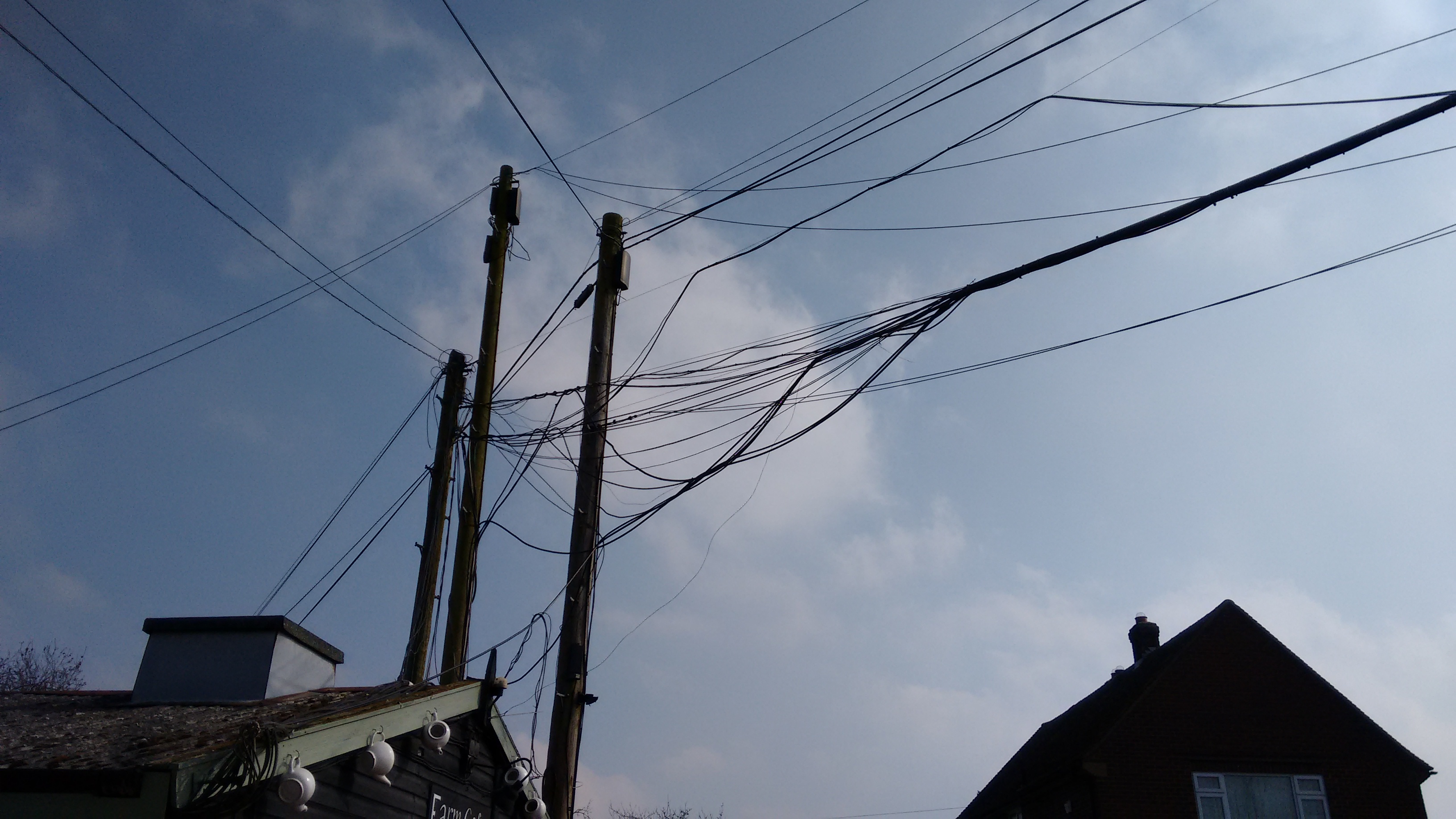 By the time we reached Ardeley for coffee we had dried our eyes, only to weep with laughter at this tangle of farming wires, which was more reminiscent of New York or Delhi:
