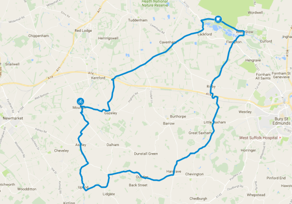 We had set out earlier that morning from the Packhorse Inn at Moulton – Maurice, Andrew, Sandra, Martin, John B, Ken, Tom and Brian – on a 30 mile circuit of the countryside between Newmarket and Bury St Edmunds. It was a chilly start but the stiff climb up the hill from Moulton soon warmed us up.