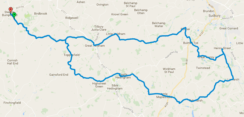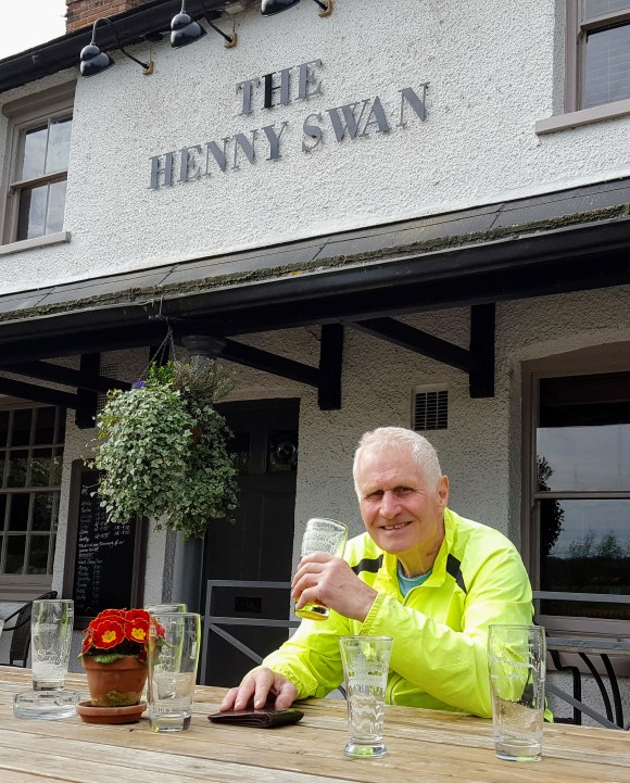 Pausing for a photo at Toppesfield, we carried on to Castle Hedingham, where we stopped for coffee and cake at the excellent Buckley’s Tea Rooms. Back in the saddle, we passed through Maplestead, Pebmarsh and Lamarsh, arriving at the River Stour where we stopped for a quick one at the Henny Swan.