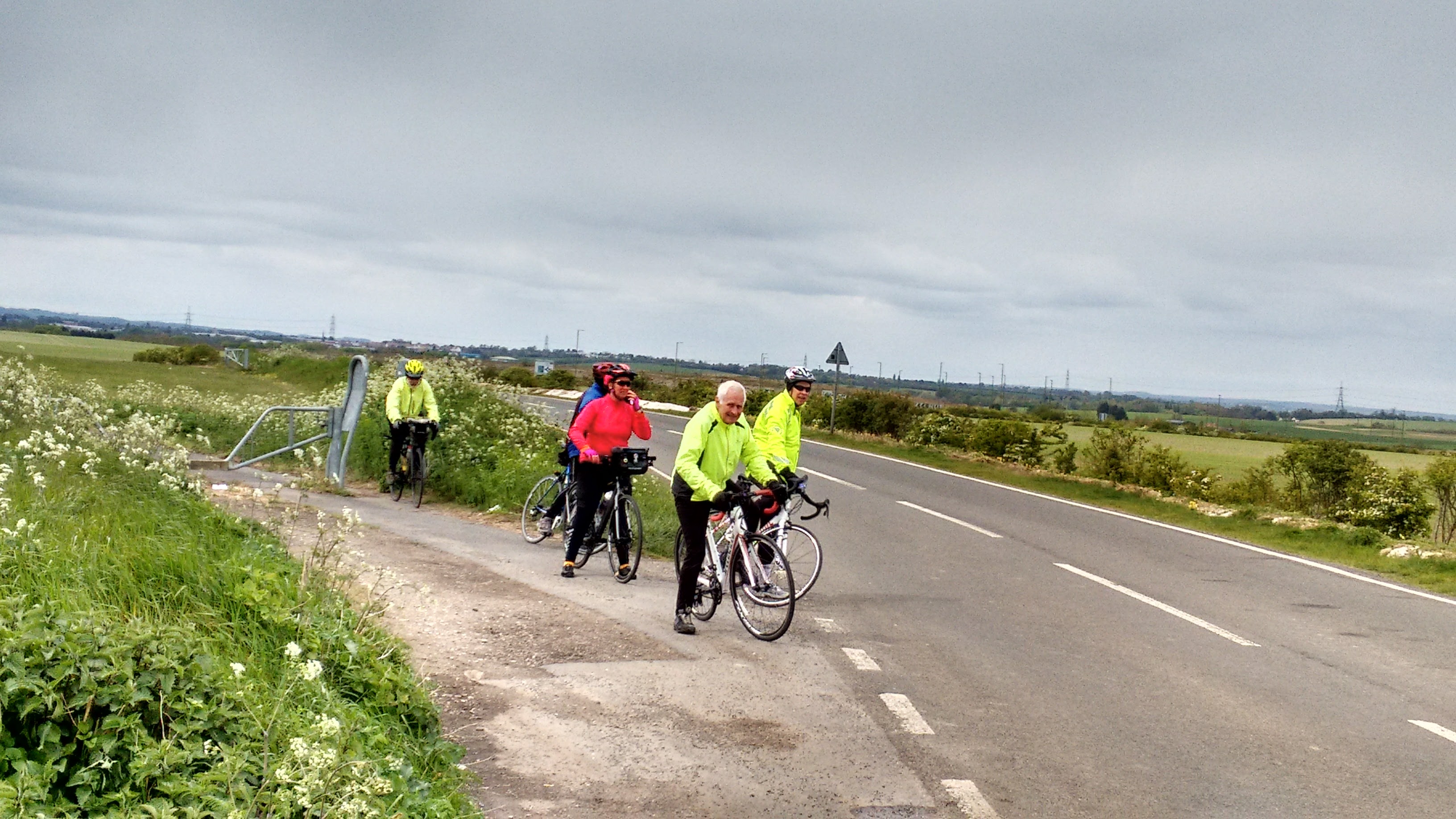 Beatrix Potter would have been proud of Sandra’s ducklings as they gathered at The Fox and Duck in Therfield on a blustery late spring day, in the absence of any risk from the wily foxes, Maurice, Andrew and Keith, who were seeking other game whilst drinking red wine with their pasties and clotted cream scones in distant Cornwall. Not only had Sandra arranged a ride in the shape of Mrs Puddle-Duck herself but she also arranged for real life ducklings to appear at just the right time as we cycled through Sandon.