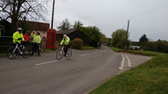 Rod, Chris and JohnT, the naughty little ducklings, eventually arrived and we all set off back to Therfield via John B’s favourite off-road route via a stony track either side of a bridge over the A505, resulting in wheel spin and pushing of bikes for some plus attempts at riding through shoulder height crush stiles without stopping. Only Rod managed to do this easily and was duly awarded the stylish stile prize: