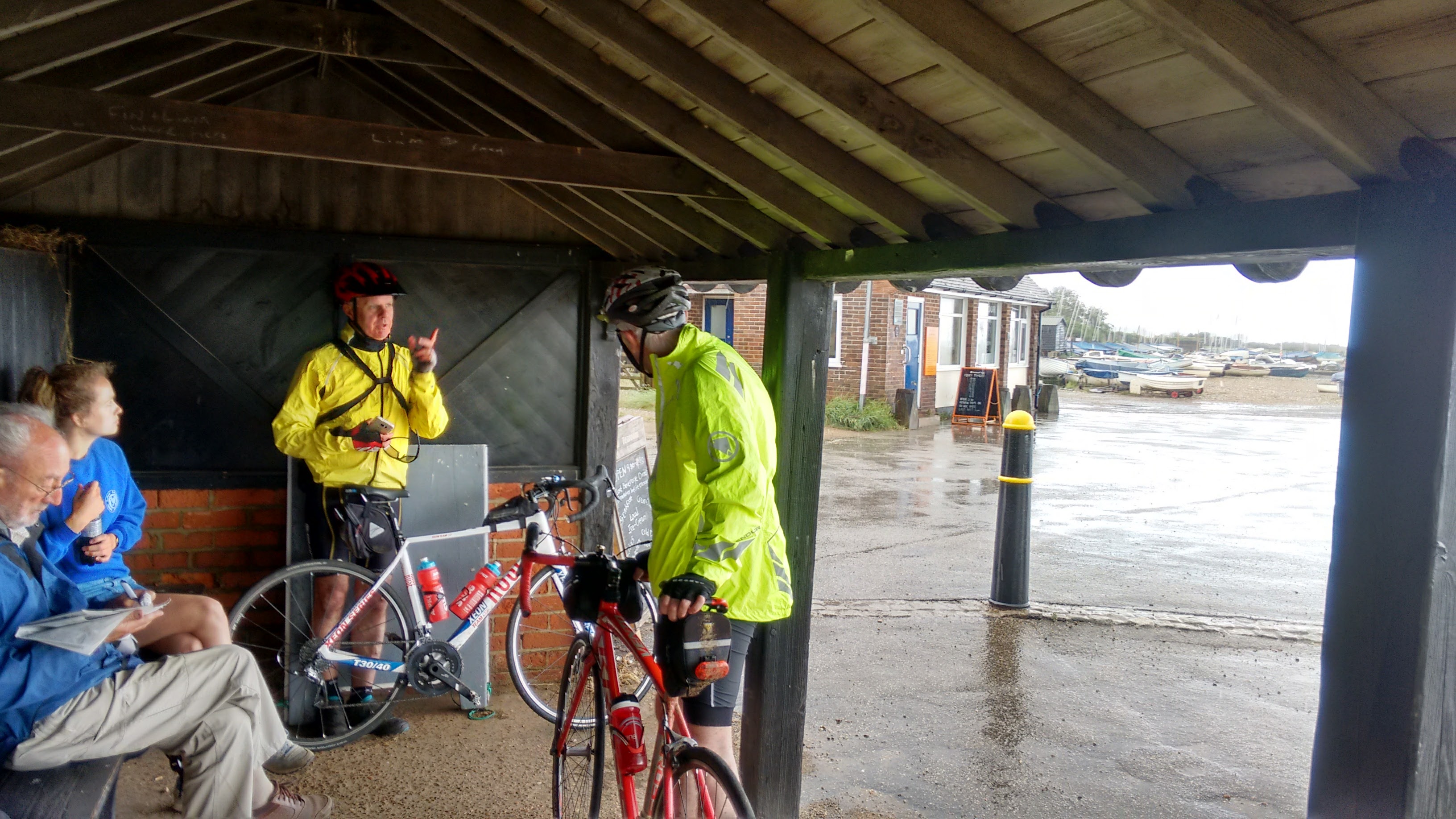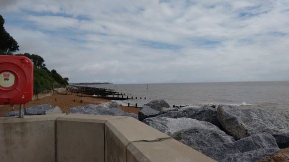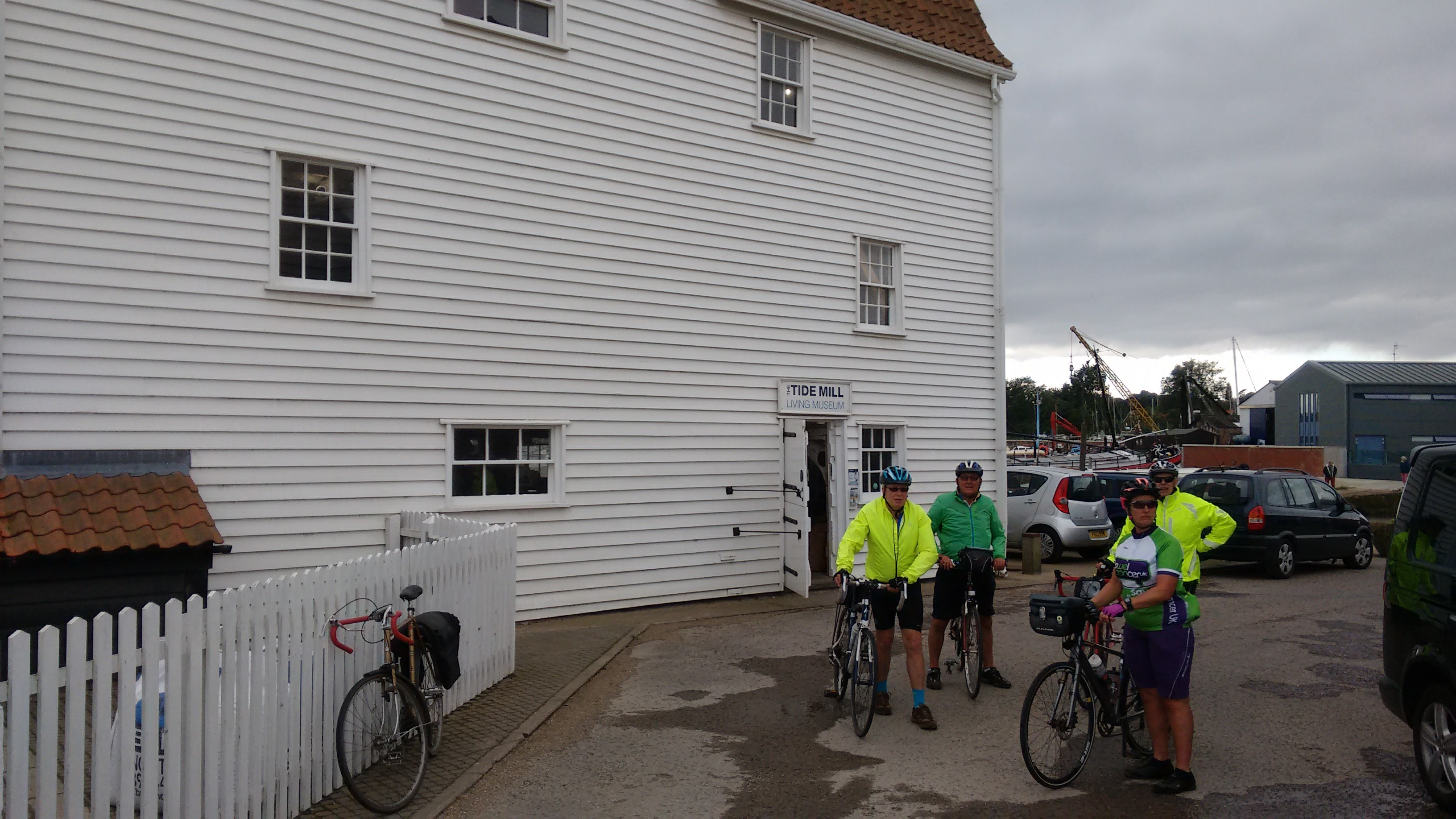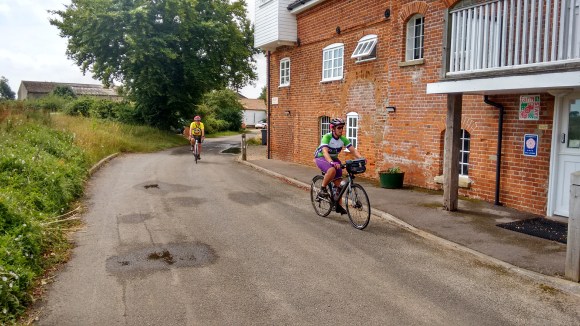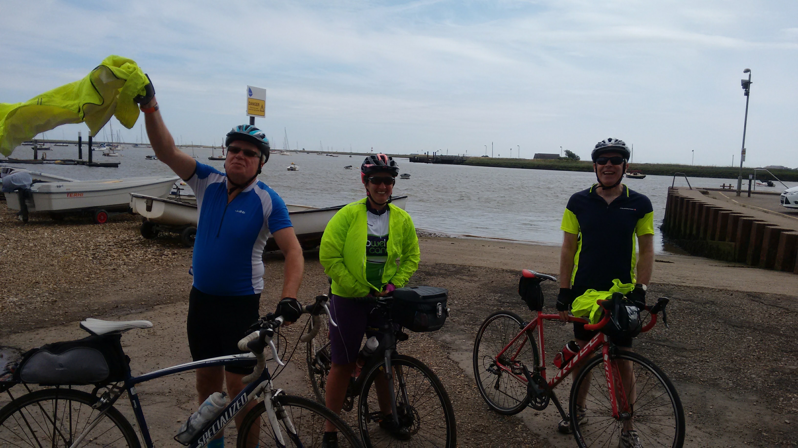 Starting from The Fox Inn at Newbourne, six Windmillers led by Maurice and accompanied by Andrew, Sandra, Tom, Chris and Martin donned wet weather gear to start with but soon stripped off after a mile as the threatened rain failed to materialise. The route took us firstly to Felixstowe old town and its grand Edwardian seafront, and then along the esplanade to a cycle path alongside the beach which was great until it ended abruptly at a flight of steps……..
