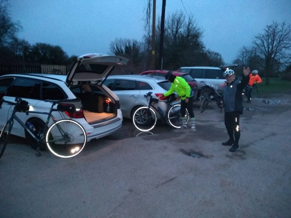 By this time it wasn’t exactly dark but we were grateful to have good lights whilst mums were on their school runs whizzing around the lanes. Nick’s back light was particularly penetrating despite its size. Perfect timing saw us back at The Bull just as the door was opening, where the usual warm welcome was received and a good natter had with the regulars.