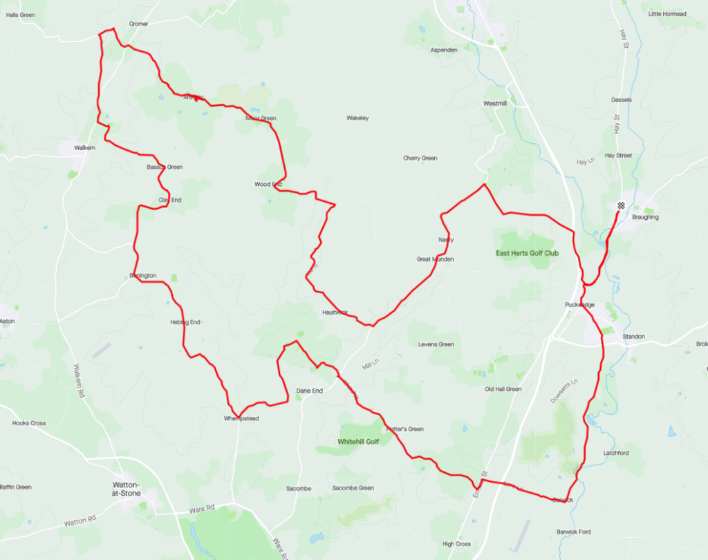 Back on the bikes, we made the return leg – via Wood End, Haultwick, Great Munden and the delightfully named village of Nasty – to Braughing and the Golden Fleece where our hosts, Peter and Jess, served up an excellent lunch and Howard, this week’s birthday boy, bought the beers.