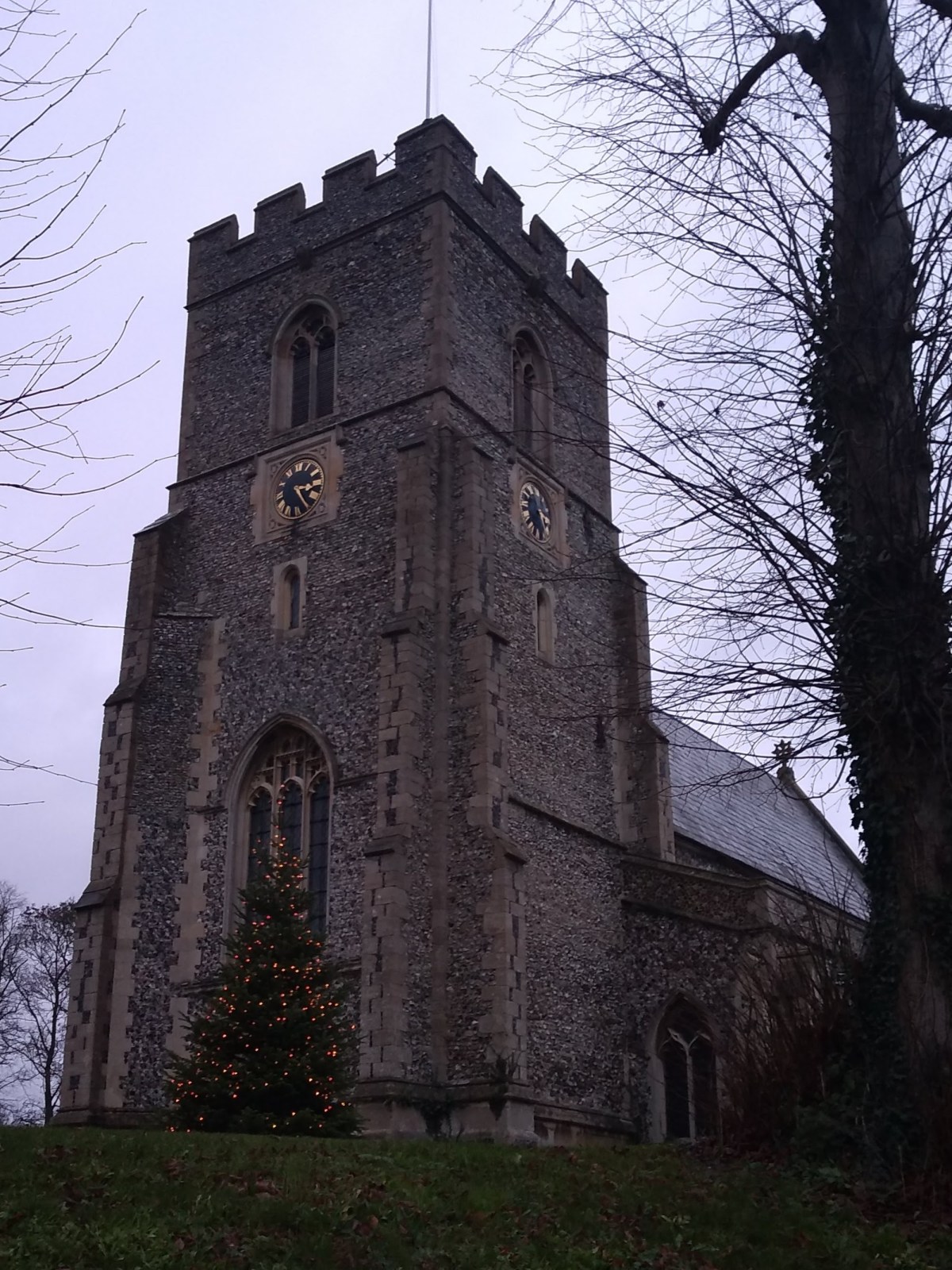 Take a look at last week’s blog and compare the difference! OK, last week’s photo of Elmdon church was taken at 12.55pm and this one at 3.25pm but what a difference in the weather. Gone are the bright blue skies and suddenly Christmas is upon us with a tree all lit up outside the church. And the roads are murky and muddy – as traditional as Christmas itself.
