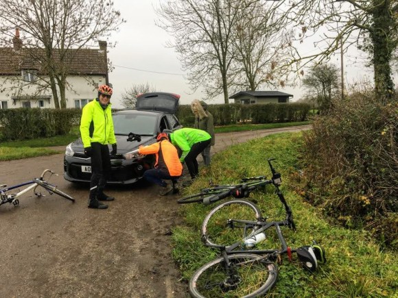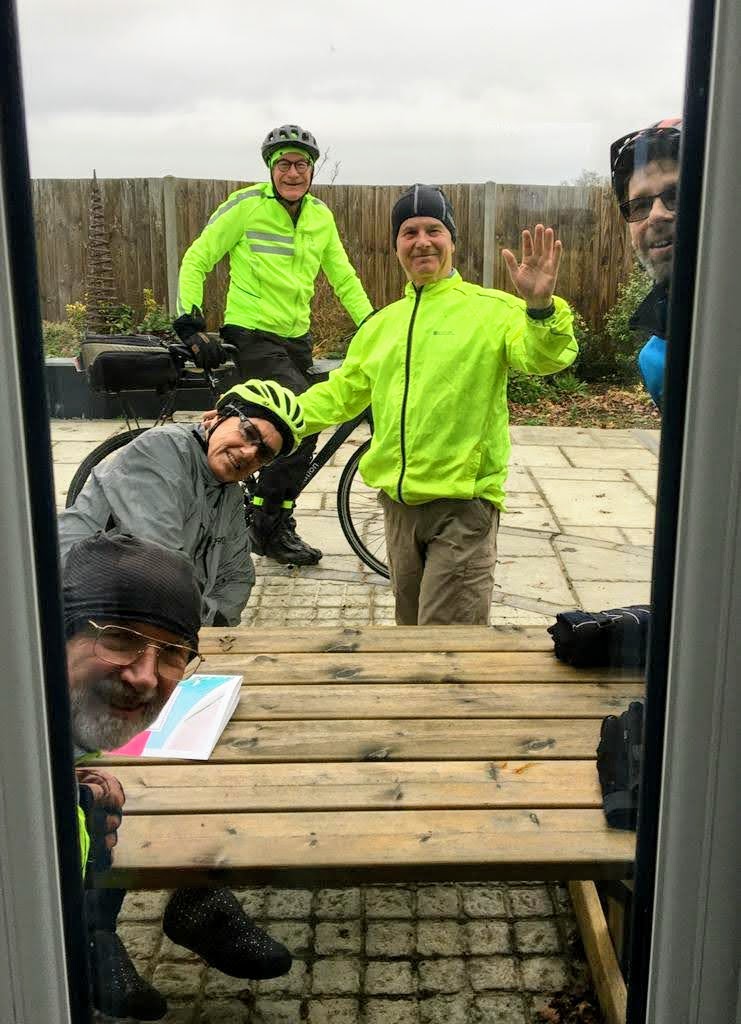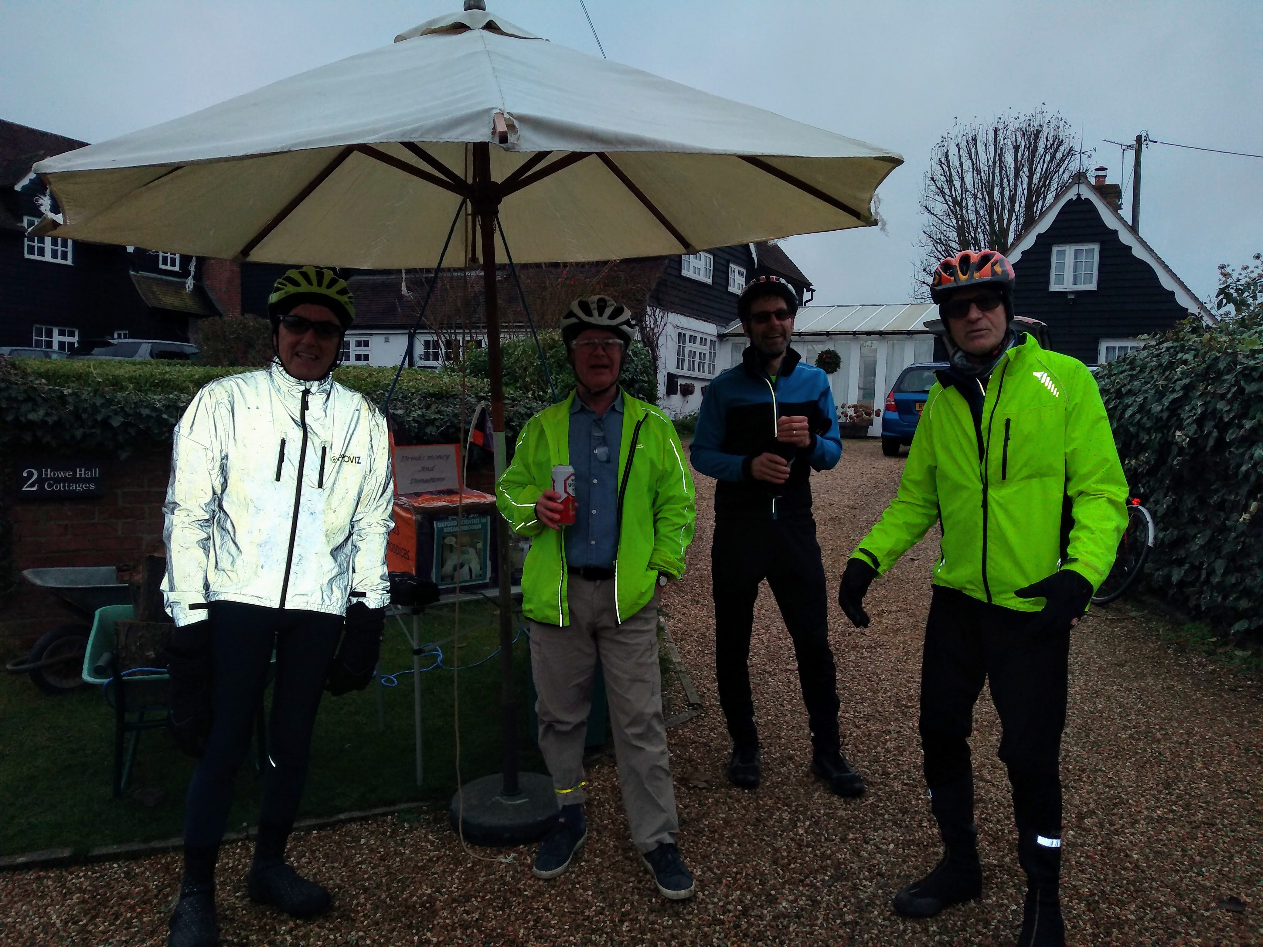 Suffering mild exposure, those of us finishing up at Simon’s were too chilled to consume cold beer and opted instead to stuff our fivers in the charity box and head for home. Poor old Victor and Brian, however, sustained punctures on the way home. Victor, making several stops to pump up his tyre, managed to get home without mending the puncture. No such luck for Brian, who found himself marooned on top of Coploe Hill with a totally flat tyre. Fortunately for him, Martin drove by on his way home, scooped him up and returned him to Great Shelford. Many thanks, Martin.