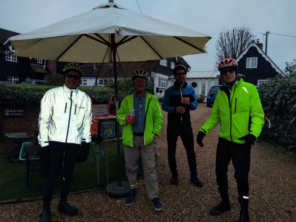 Meanwhile, the day was turning out colder than forecast and we were looking forward to stopping off at Poppy’s Barn for coffee, sustenance and warmth. Alas, we had to sit outside and freeze as Geoff, Ken and Deborah had beaten us to it, arriving early and commandeering three separate tables (remember the rules; no household mixing!) Whereupon the proprietor, deciding she could not accommodate any more cyclists inside, asked the rest of us to sit outside. Humph! Neither did it help when Deborah gave us a jolly wave through the window as she tucked into her full English breakfast.