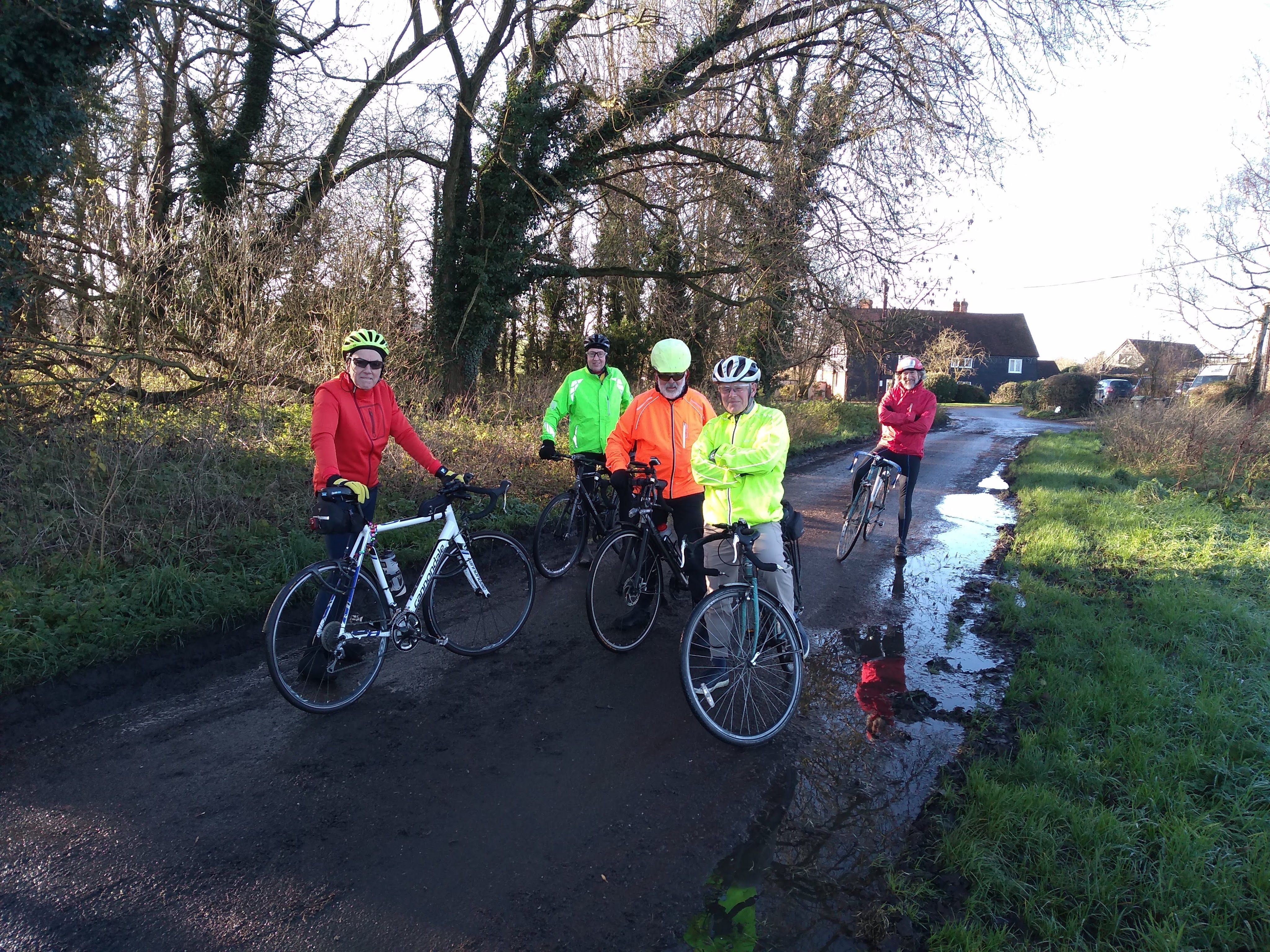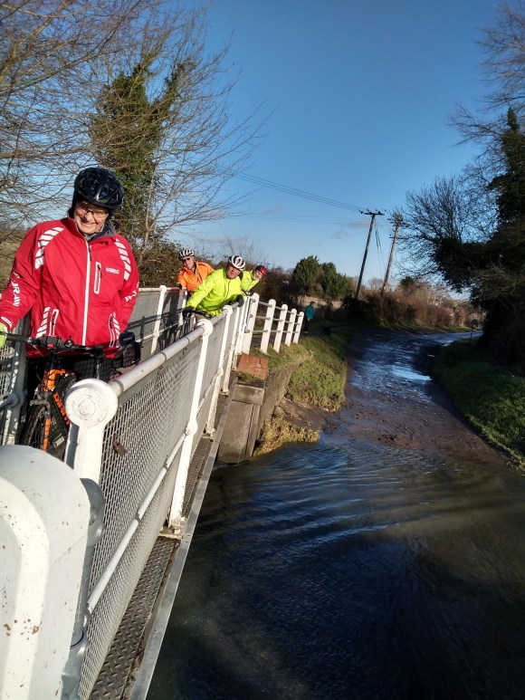 Flooded roads, low temperatures, mud, murk and punctures were now de rigueur for the rest of December. The 10th marked a striking contrast between the haves and the have nots amongst Windmillers. The haves, including Graham, Mike, Geoff, Deborah and Ken smirked contentedly inside the warmth of Poppy’s Barn as they tucked into their coffees, cakes and, in Deborah’s case, a full English breakfast, whilst the have nots comprising Brian, Lawrence, Simon, Victor and myself were forced to sit outside in the freezing cold and wait ages for their coffee whilst also being told off at regular intervals by the smartly dressed waitress for leaving our bikes and items of clothing in the wrong places. Whipped cream coffee was strangely not on the menu.