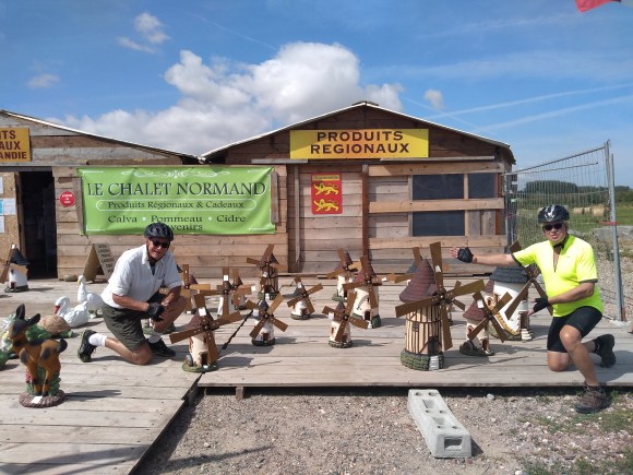 Thoughts of croissants, coffee and Calvados started on Rod’s birthday ride on 10 July as three of the French contingent, Andrew, Simon and I, had a warm up ride with 9 other Windmillers before a socially distanced lunch at The Golden Fleece in Braughing. But Andrew and Simon couldn’t resist really getting in the mood: