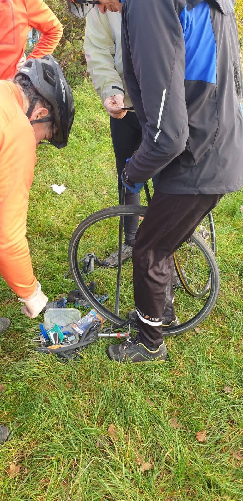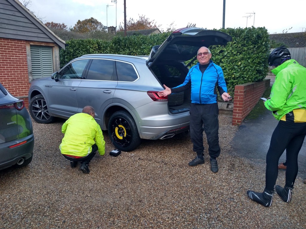 Sandra came to the rescue of Rod on 6th January, Victor and Brian helped another cyclist on 12th November, Howard came to the aid of a damsel in distress with a puncture in a wheel of her car (see above) but Deborah is the clear winner because of the amazing work she does for The Samaritans (often appearing for a ride with blurry eyes having done a night shift) and for rushing Mike to hospital in Chelmsford on 1st October.