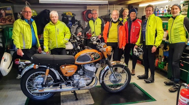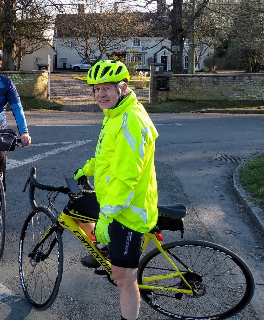 But it did start well, didn’t it? Except for Brian who had two punctures, one in each wheel, on the first ride on 2nd January. There was also speculation that day as to what might lie in the year ahead – would Deborah buy some mudguards, would Andrew stop banging on about Schwalbe Marathons? Harmless stuff like that but no mention of what would hit the world later that month when the Corona virus started to spread in China, Italy and Austrian ski resorts. On 6th January, Rod had a nasty fall on a slippery road resulting in a cracked helmet and a bent bike but Sandra came to his rescue in her van and scooped him up. He was a bit bruised but luckily nothing else was broken. Brian’s birthday was celebrated on the 24th at The Black Bull in Balsham and on the 30th nine Windmillers inspected Nigel’s immaculate motorbike workshop and stuffed themselves silly on Sue’s buttered tea loaf and shortbread.
