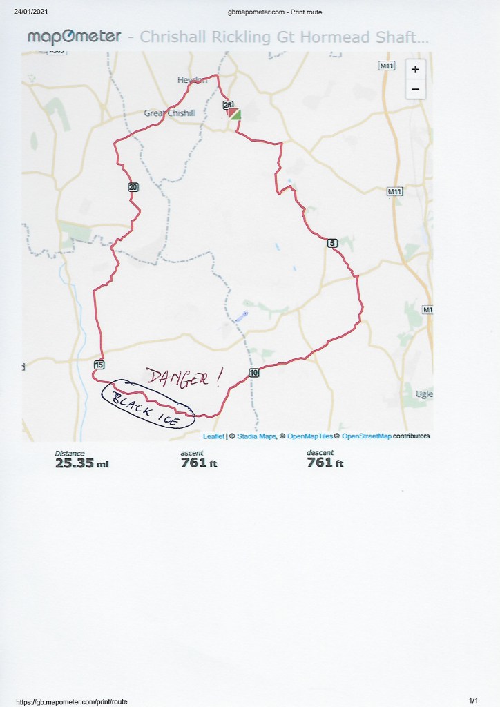 Others taking part were Howard, Julia, Lawrence, Brian and Jeremy. Howard and Roger were warned about the ice as they passed through Anstey and escaped unscathed, Julia used her gravel bike and went off road at times to avoid the ice, Lawrence went off-route, courtesy of Komoot, which must have known of the ice as it took him a different way, and Brian / Jeremy must have had a premonition of the disaster to come having announced beforehand they would not be riding the Furneux Pelham stretch – wise men! (Actually, it was because they were starting from Shelford – lucky them.)