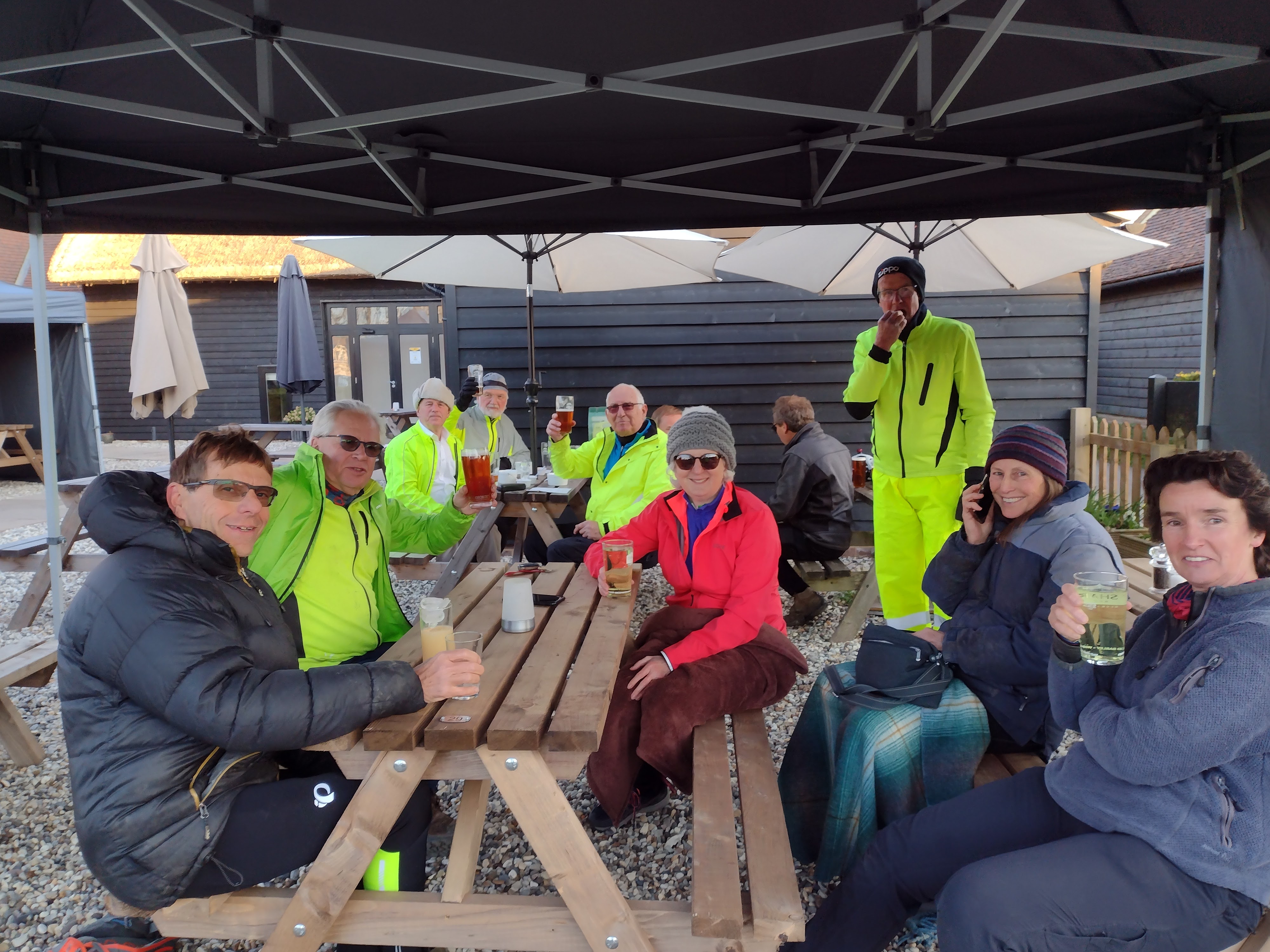 It was great to have Sandra with us again after a long absence, showing off her smart new van full of familiar equipment for shearing Alpacas and mowing lawns. Likewise, it was great to have Simon O join us and so together with Andrew, Charles, Deborah, Jenni, Nick, Simon T, Lawrence, Alan, Jeremy and Martin, that made 13 Windmillers in all who set off in two groups at 4.30 pm to navigate the local lanes in near perfect conditions.