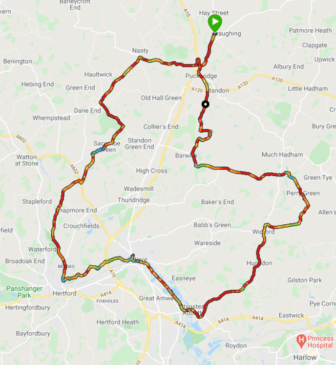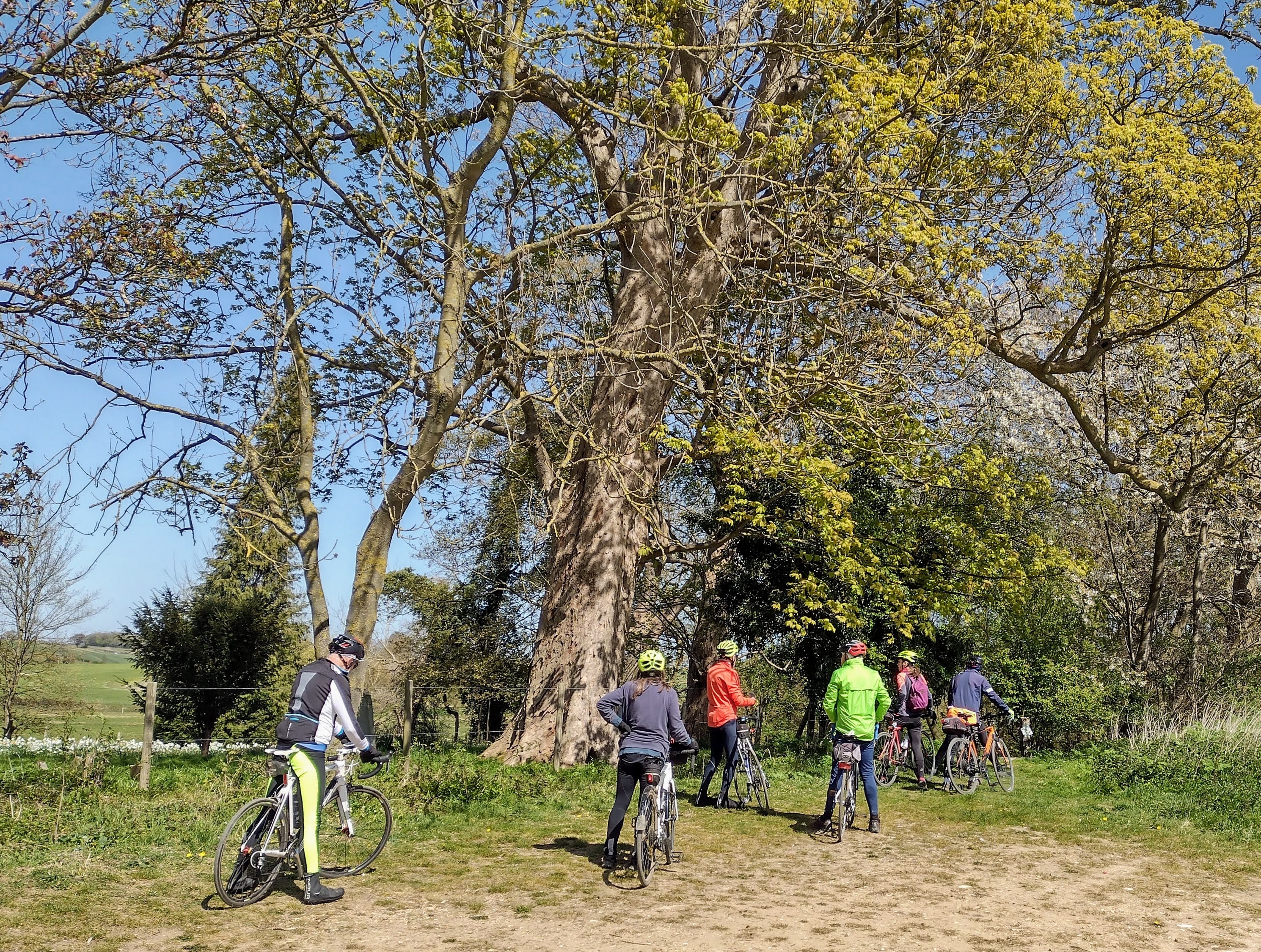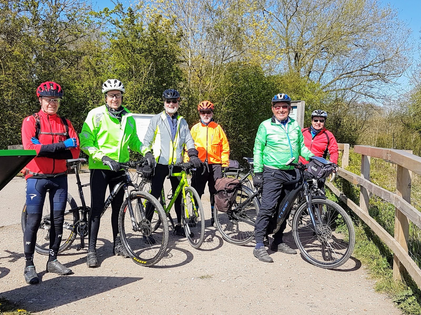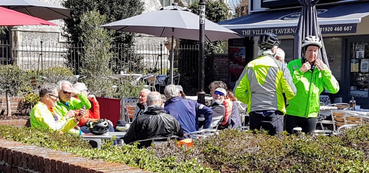 Some seventeen Windmillers had set out several hours earlier from The Golden Fleece at Braughing for a thirty-odd mile circuit of East Herts and the Lee Valley. This being Maurice’s home turf, he had included some particularly lovely lanes and riverside paths, and highlights along the way included the view over the bird reserve at Amwell, the gazebos overlooking the River Lee at Ware, and a stopover in Ware itself for some excellent coffee and cake.