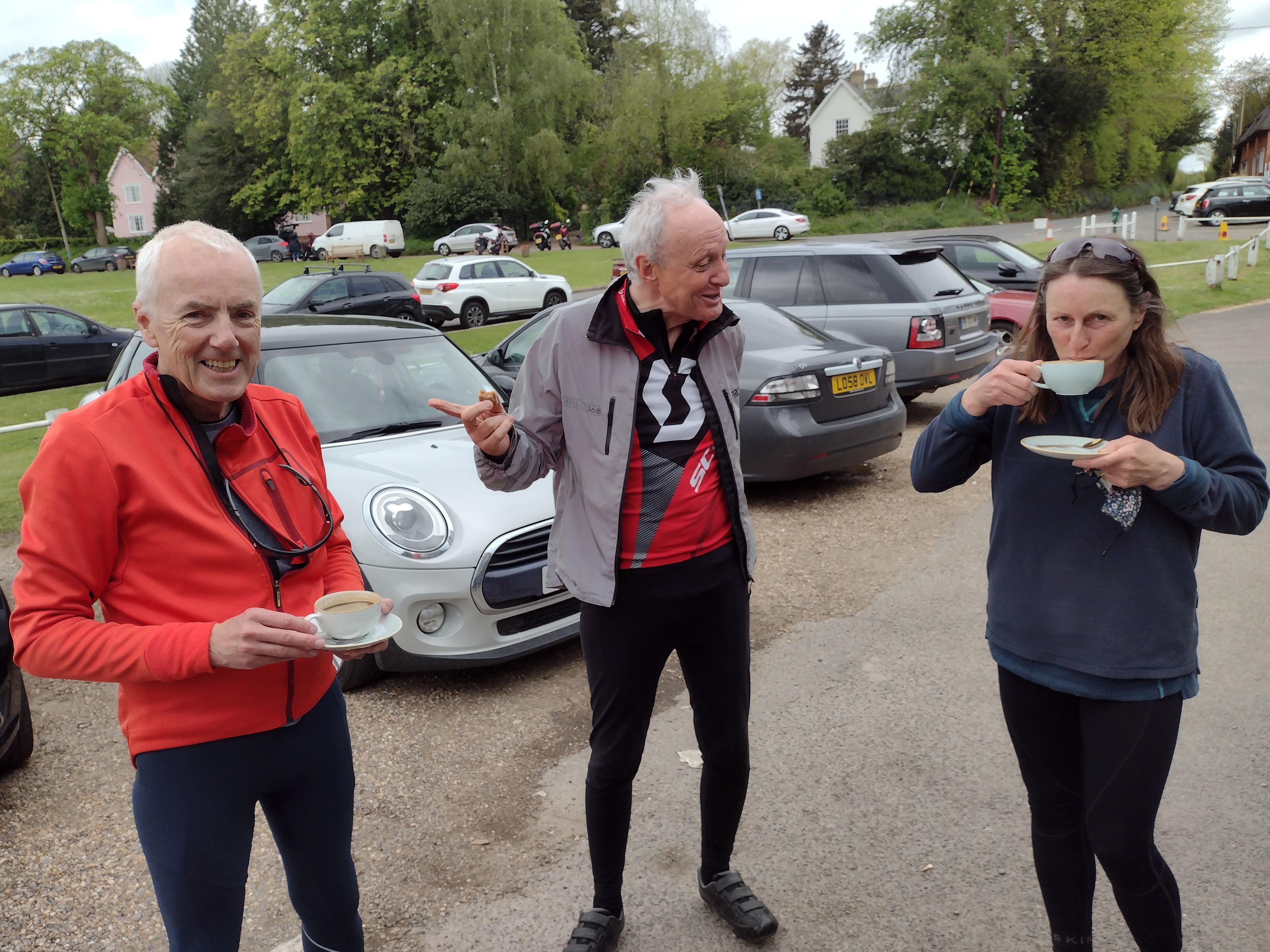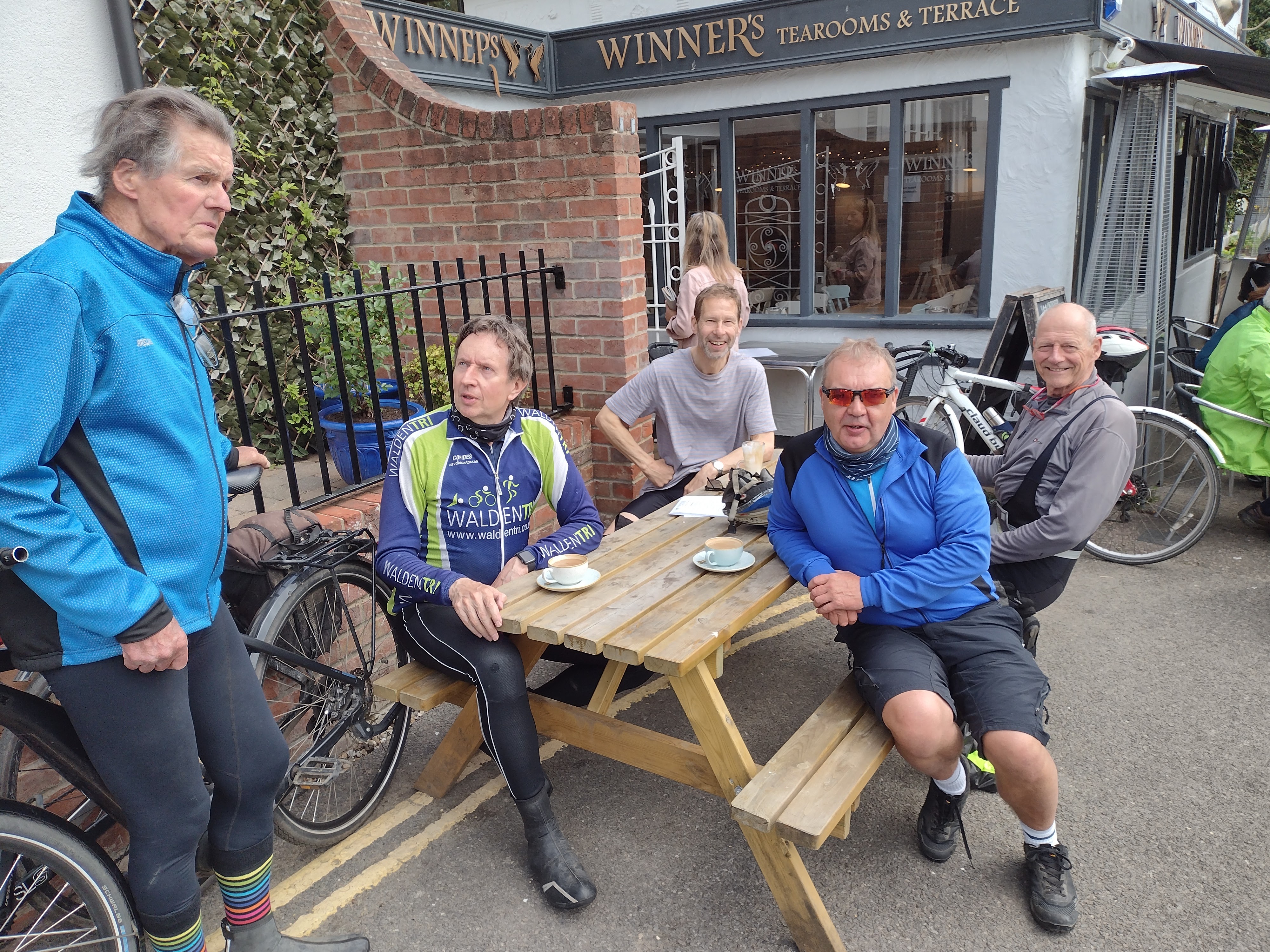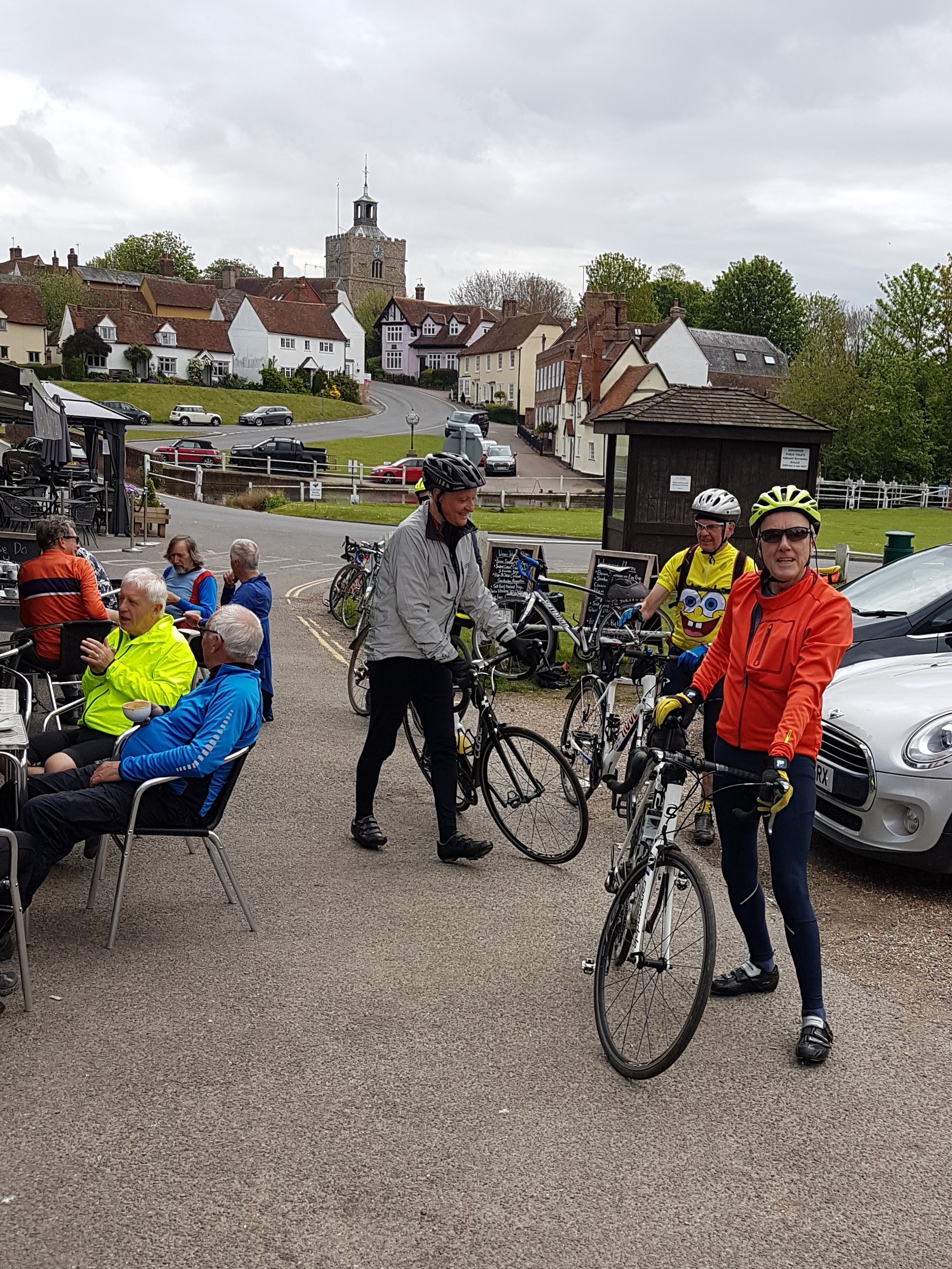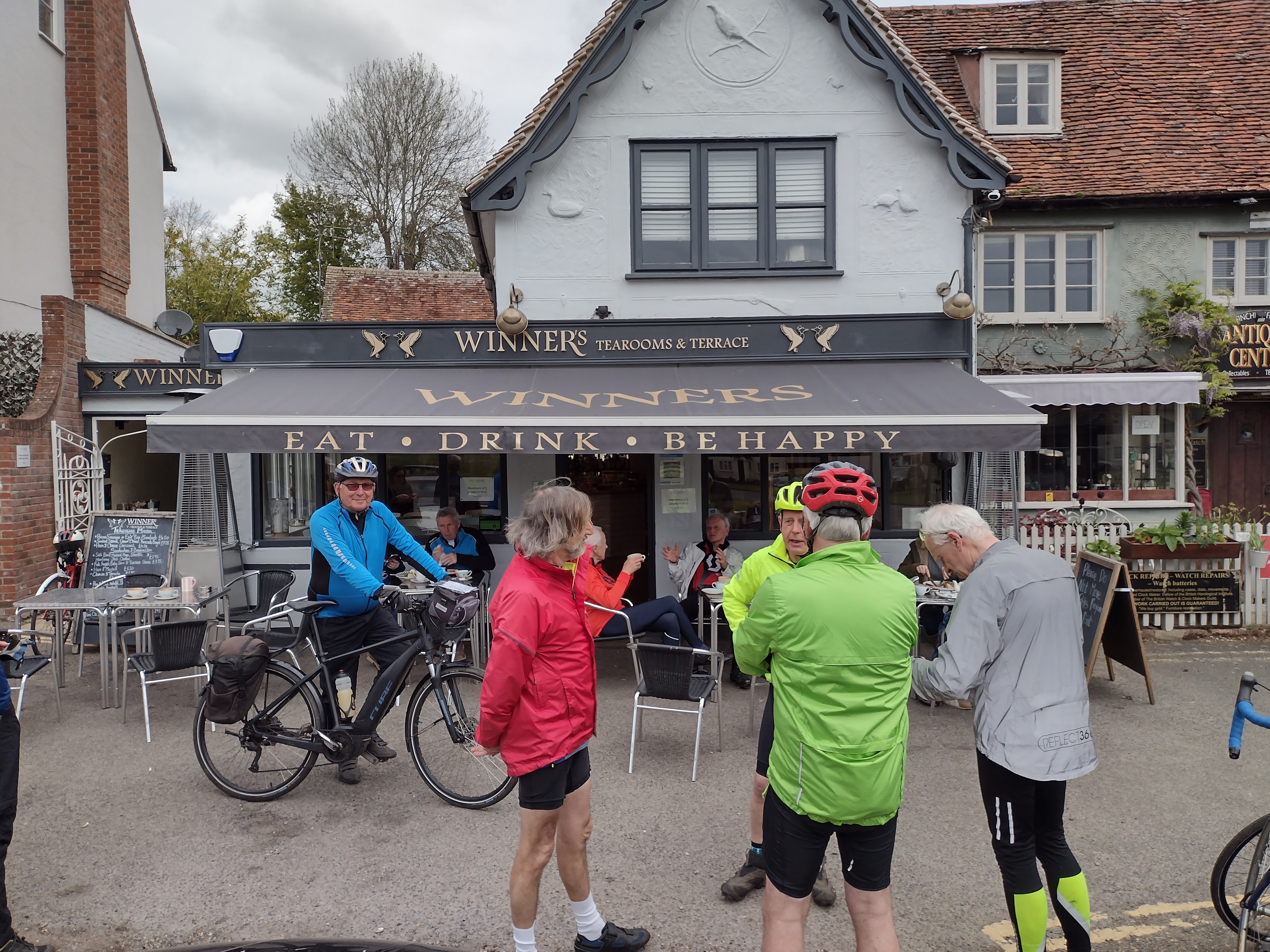 There seems to be always someone who is the centre of attention on a ride and this week it was the turn of Tom who arrived without his helmet (so easily done in the morning rush). Deborah came to the rescue (as often happens in these situations) and promptly whizzed off with Tom to a friend’s house to collect one. That made Tom, Deborah, Brian and Roger the last of three groups to set off, the first one being led by Maurice who shot off as usual at high speed and Martin leading the second group. But it wasn’t long before groups merged, demerged and even went different ways before all met up at Winners Café in Finchingfield for more coffee.