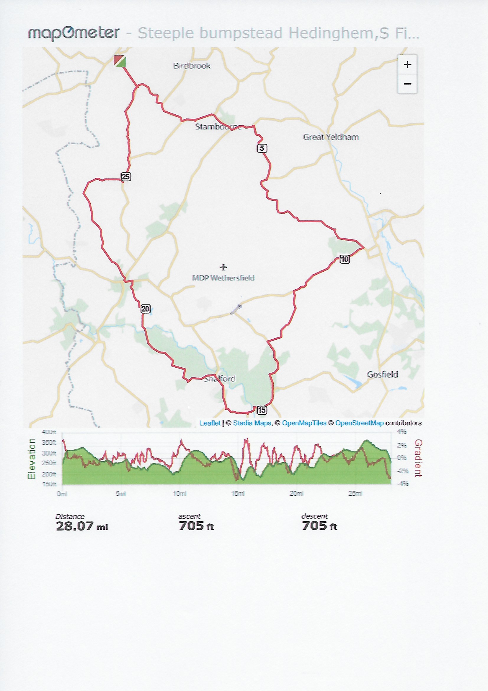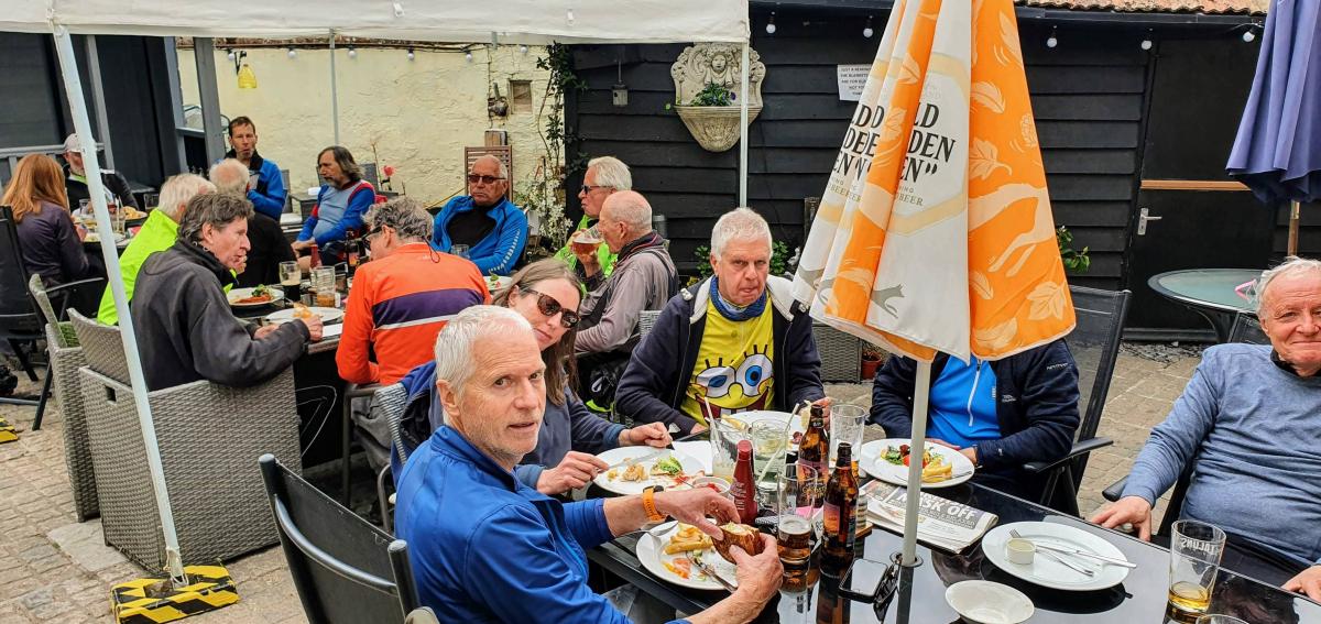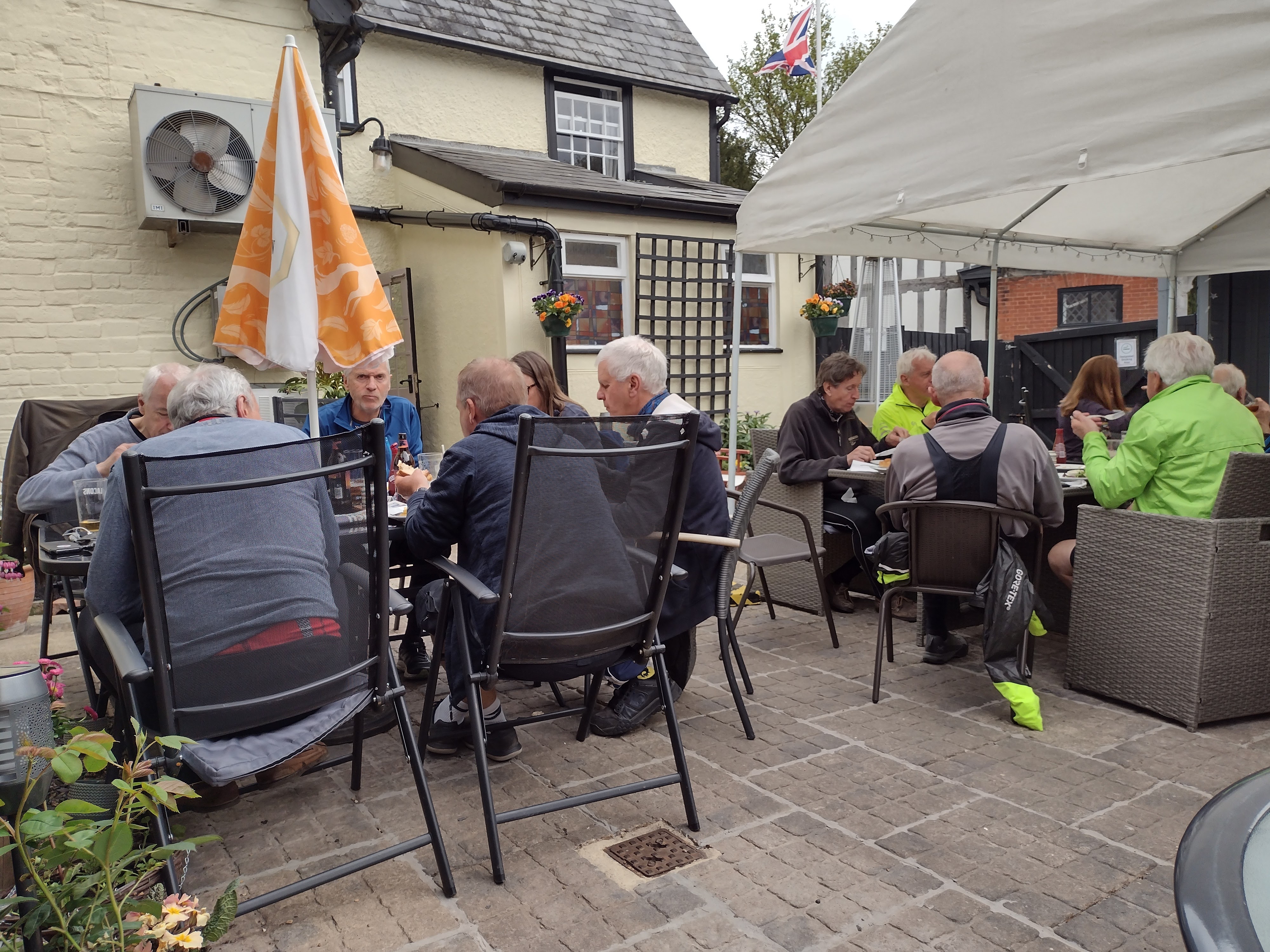 It was only a short ride back to Steeple Bumpstead where excellent beer and a good lunch was devoured in the courtyard at the back of the pub, the drinks being very generously paid for by Mike whose birthday we celebrated in an out-of-tune style. If choirmaster Lawrence had been with us we might have achieved a better rendering of Happy Birthday. Room for improvement before the next birthday is celebrated, which seem to be coming fast and furious at present.