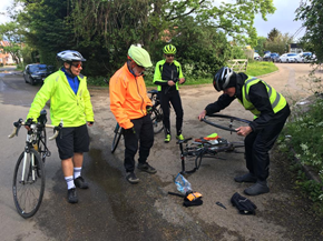 The rest of the ride was enjoyed by everyone in fine weather and with no more impatient drivers. We were about 2 miles from the end just before Elmdon when the second Stop call went up. Alan had a puncture in the rear tyre.