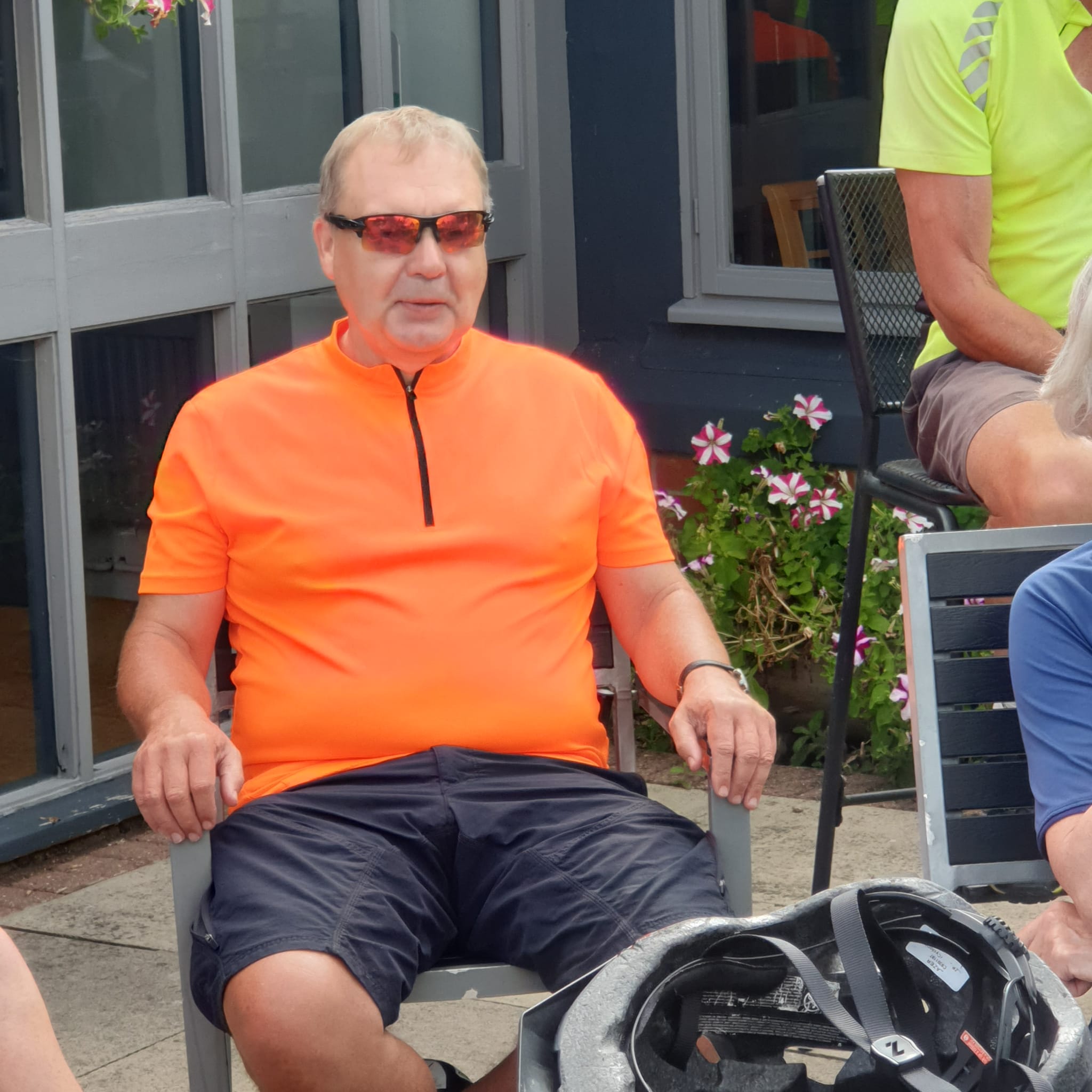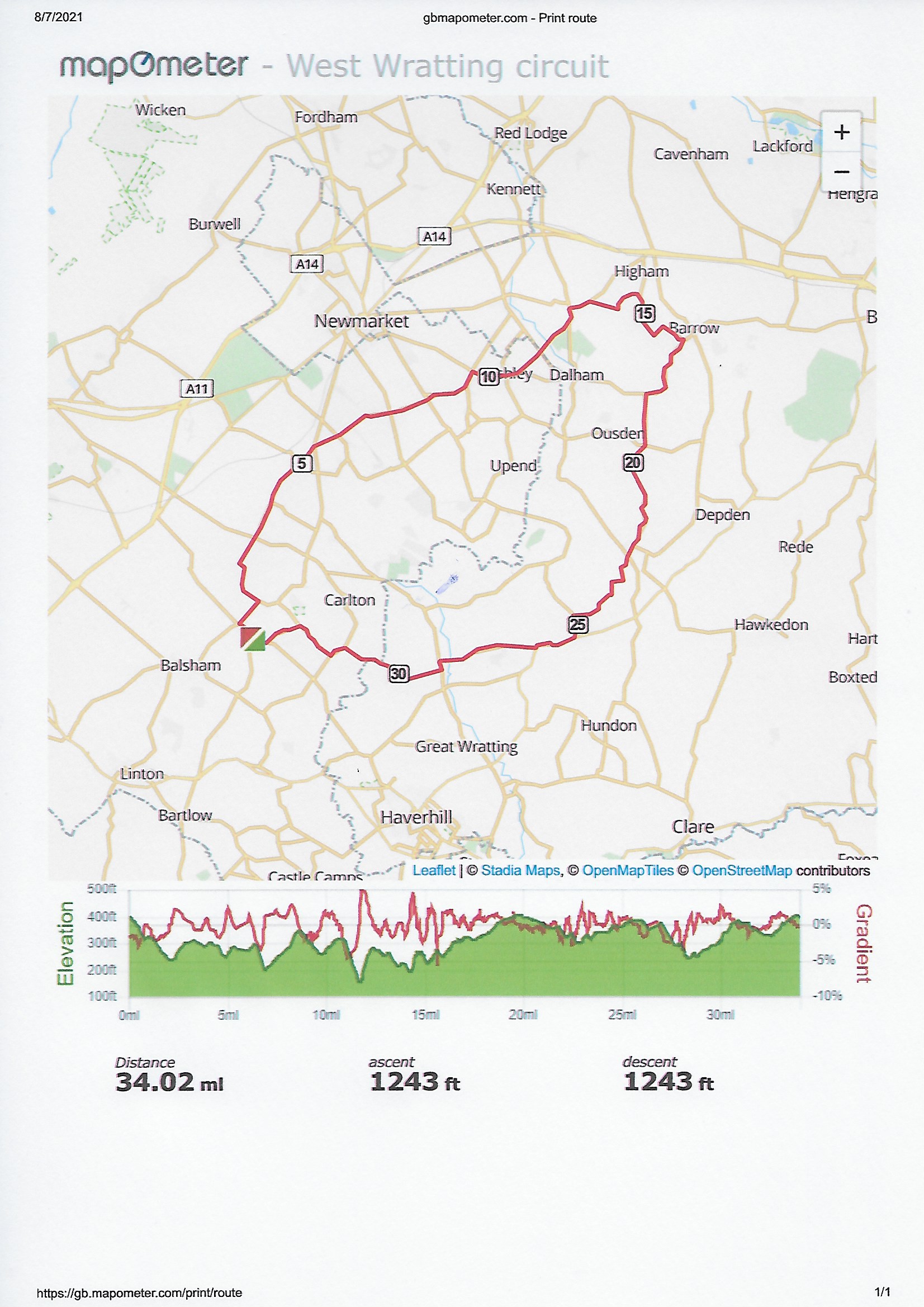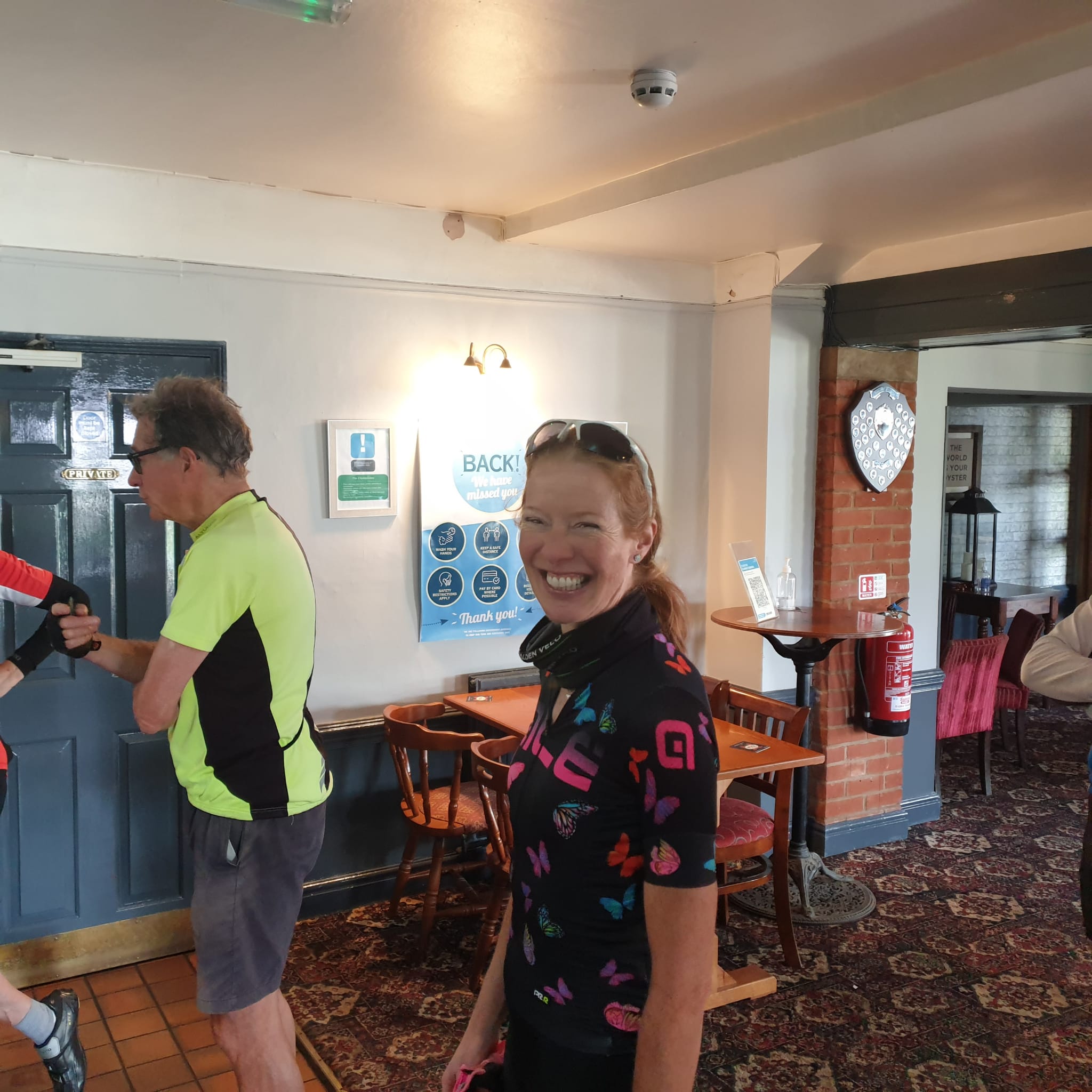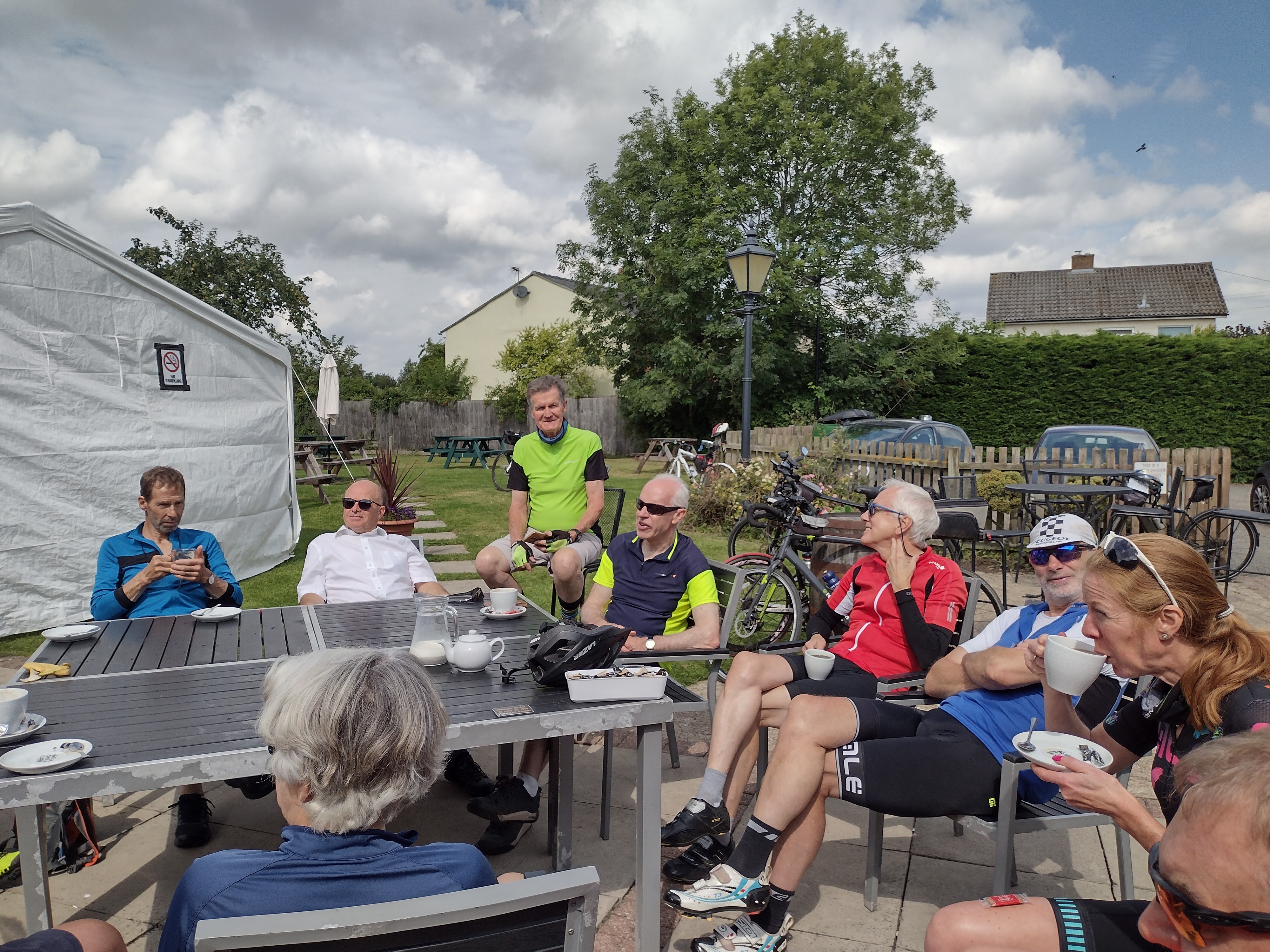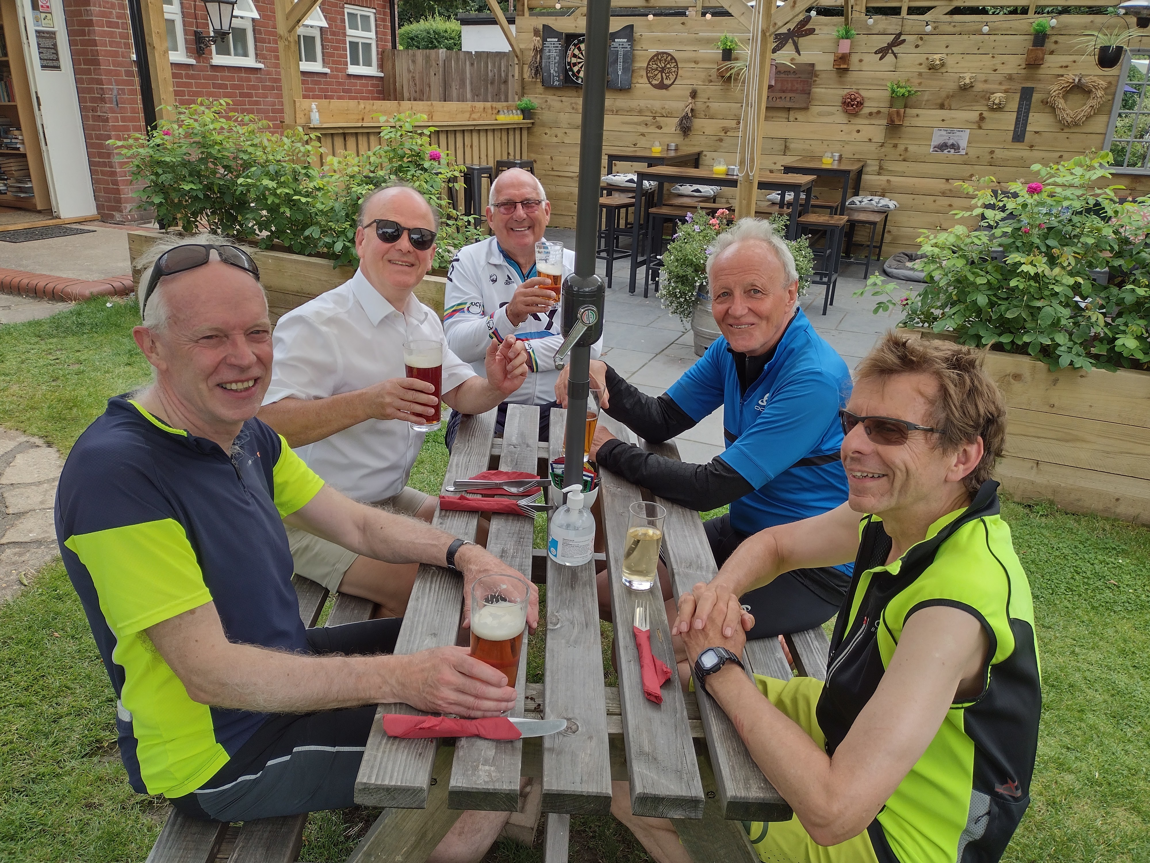 Back at The Chestnut Tree after a delightful ride through very quiet lanes but with a strong head wind on the last leg, we sat down at reserved tables in the garden to enjoy pints of Red Herring and other beers / drinks whilst eating fabulous sandwiches and other dishes, all delivered in such an efficient manner. The ham can be highly recommended, sourced from a Suffolk farm and cooked at the pub. It was great to be joined by Geoff who had done a ride starting from Balsham.