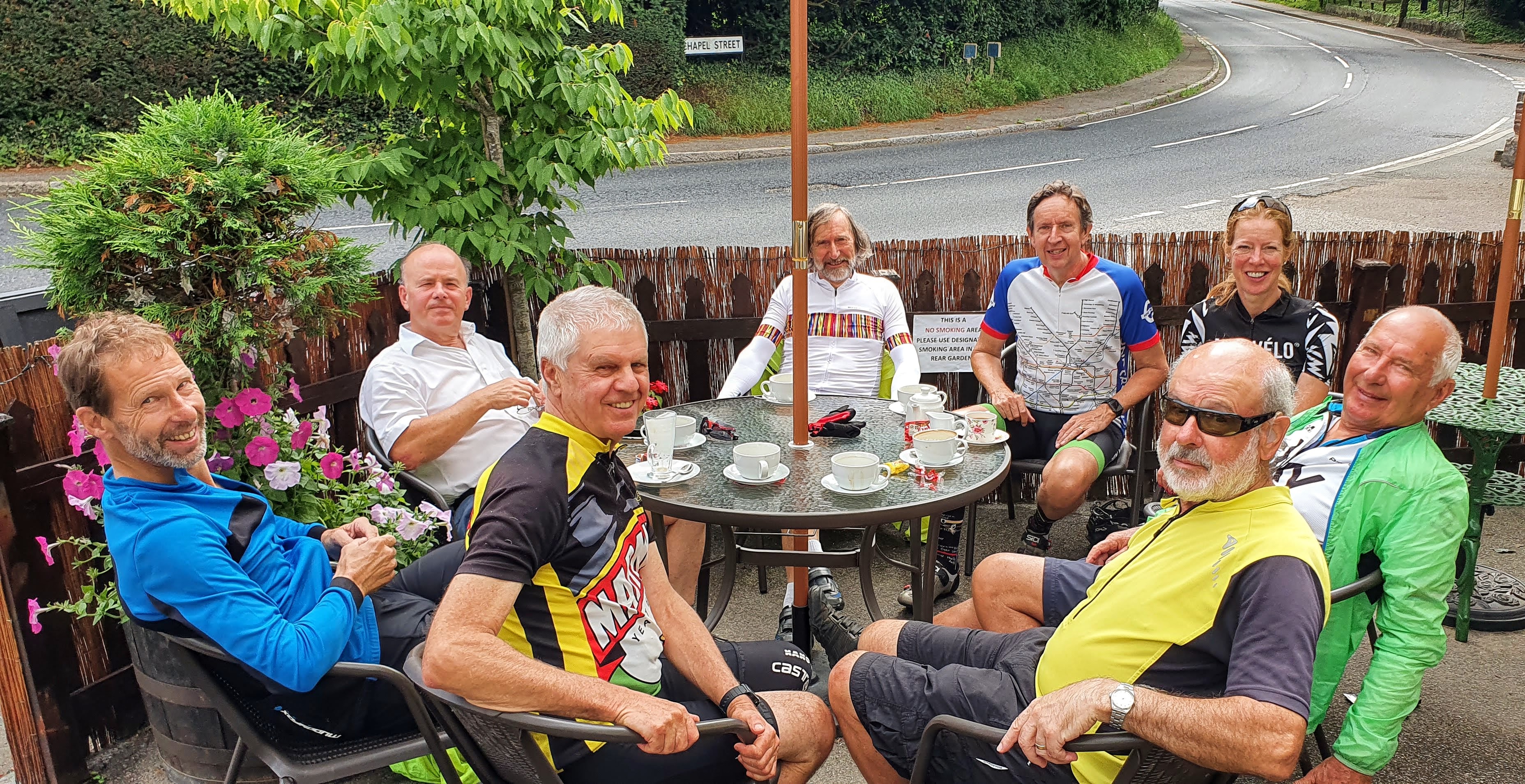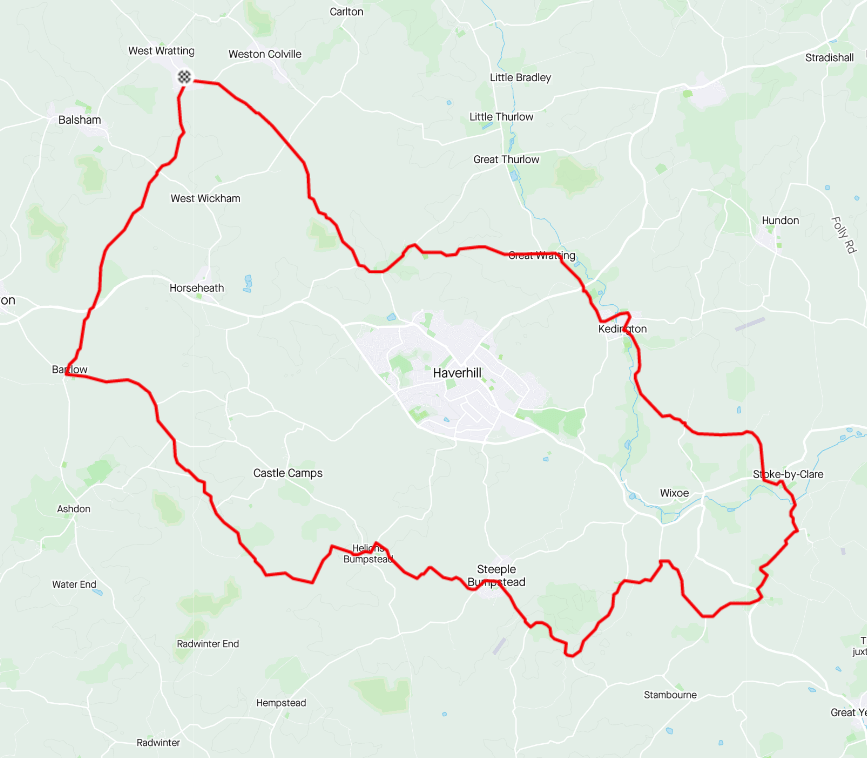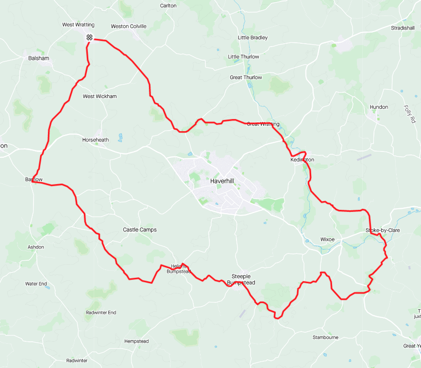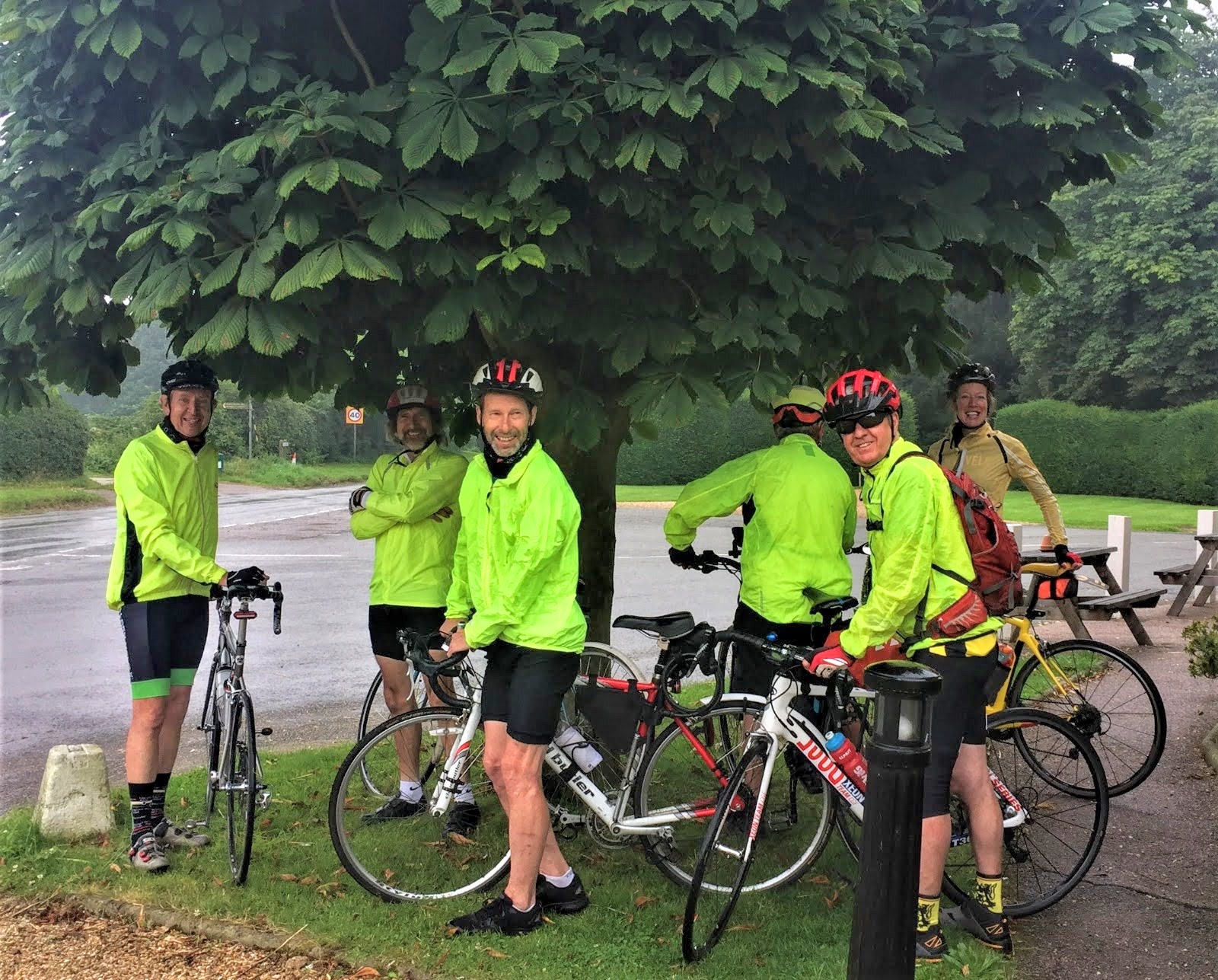 Thursday morning saw a goodly turnout of sixteen Windmillers set off from The Chestnut Tree, West Wratting, for a 30-odd mile tour of West Suffolk. Deceived by the forecast of a dry day, some were regretting leaving their waterproofs at home as they headed out into the persistent drizzle.