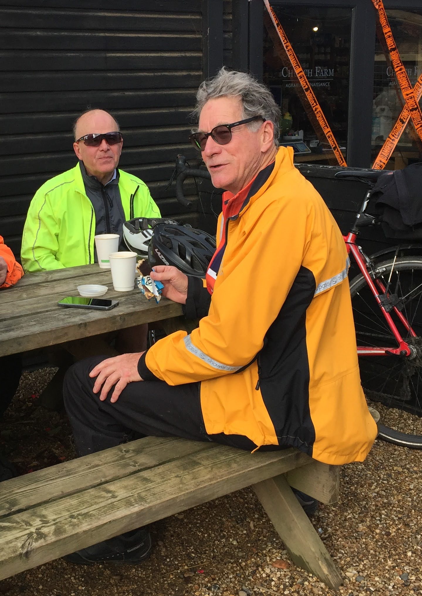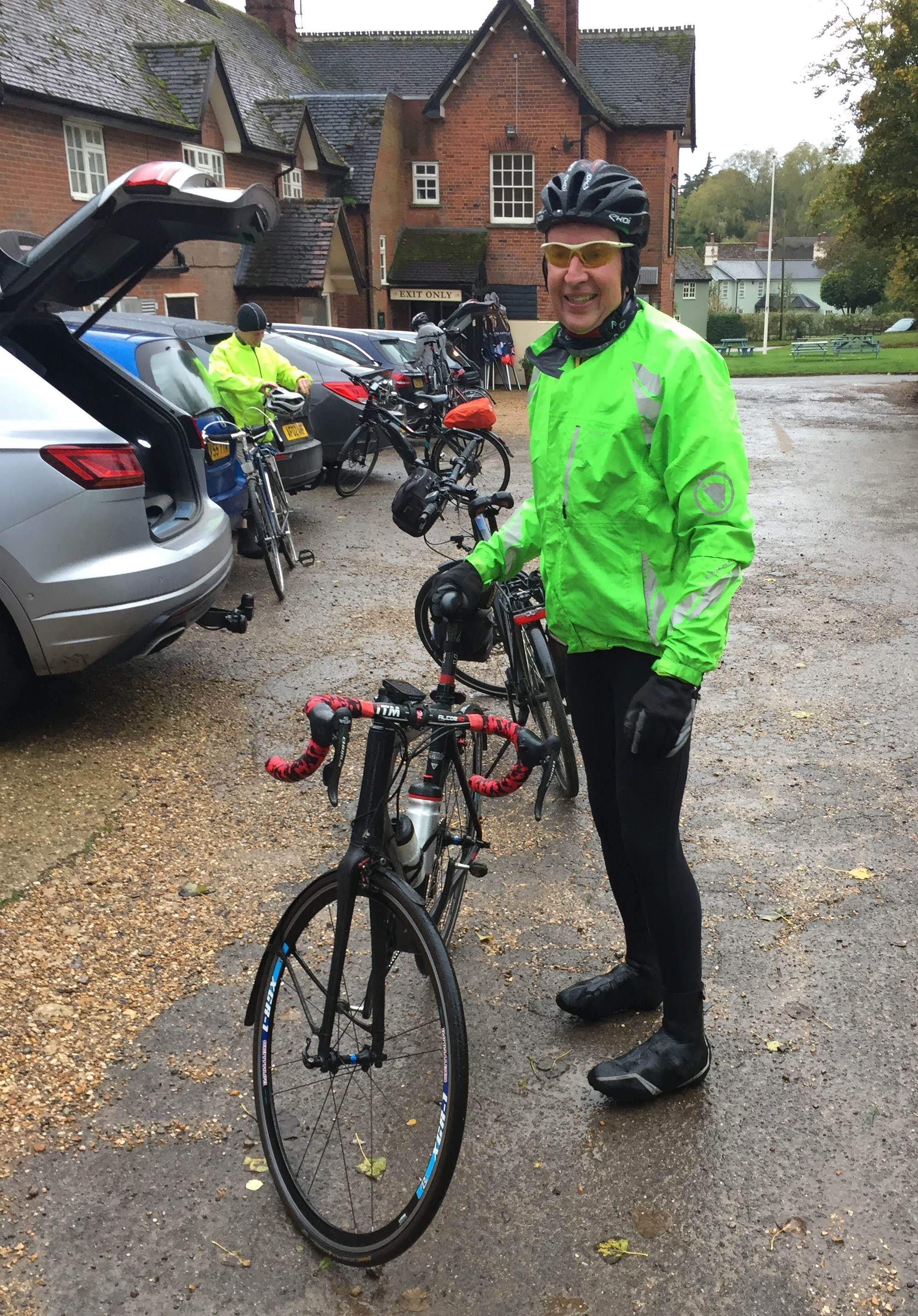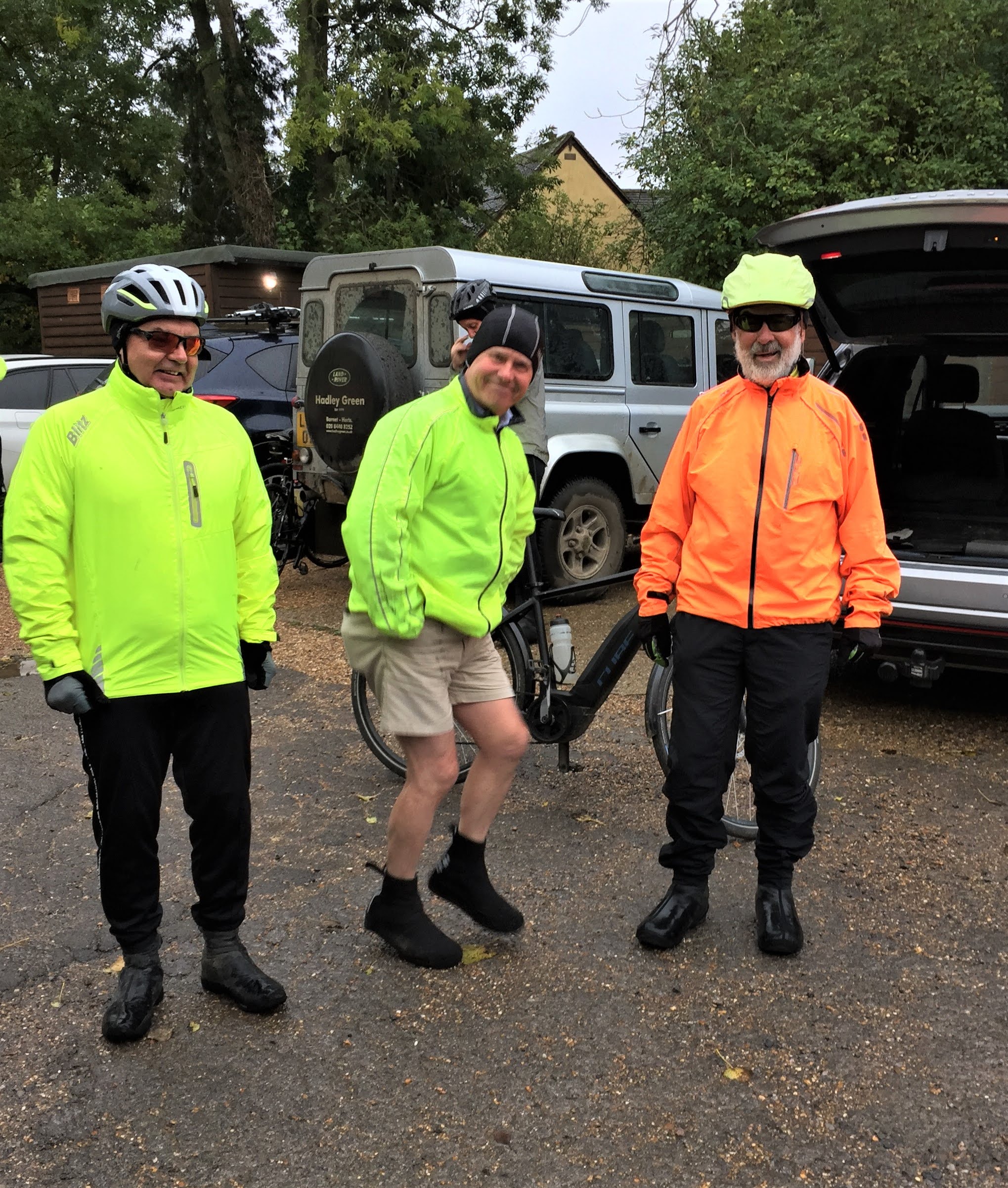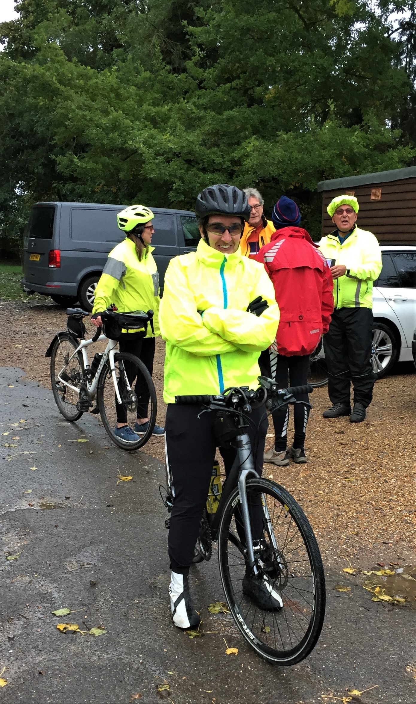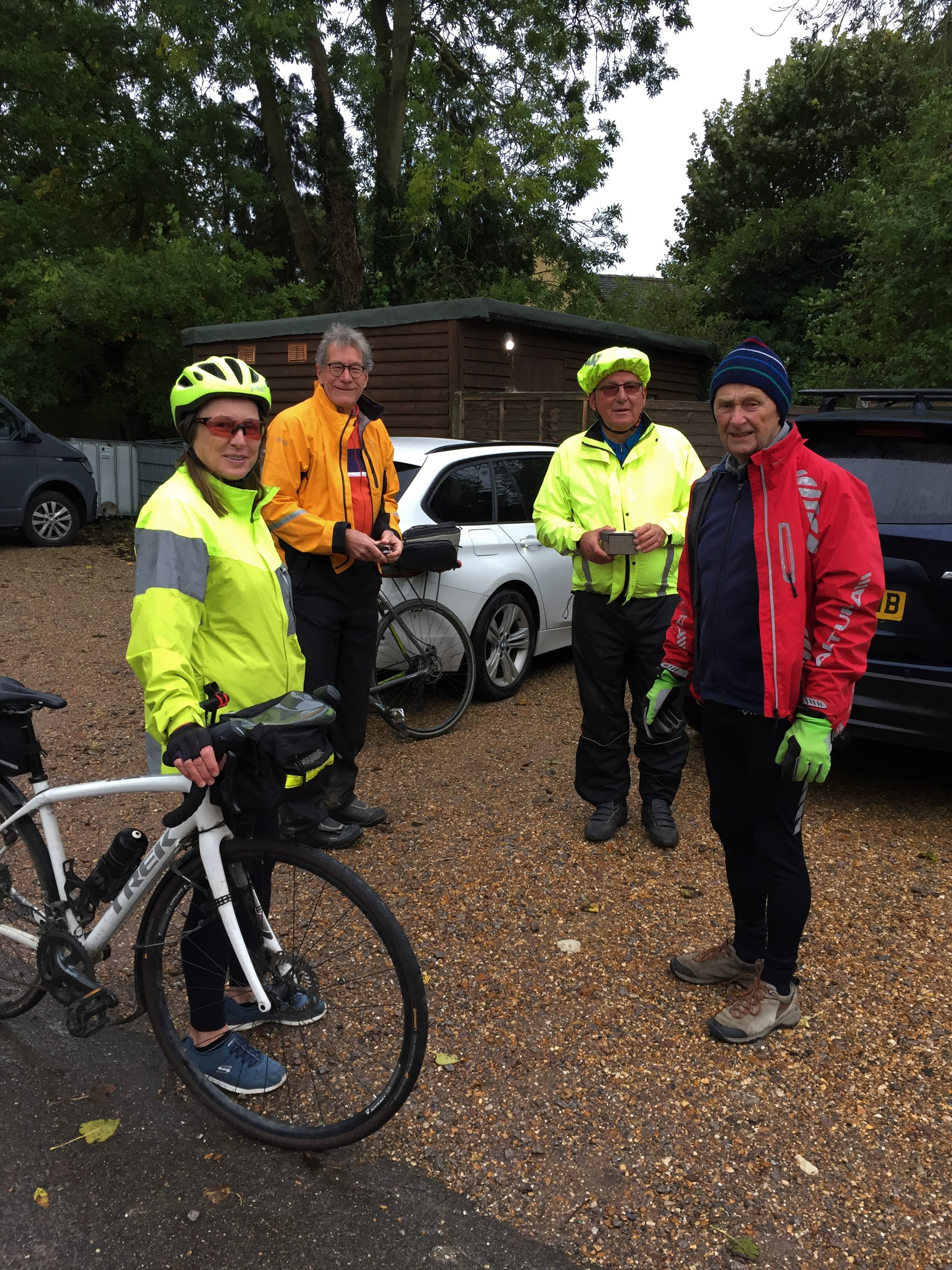It was a go, no-go decision for Ken but, recovering from a bug, he decided wisely to do a shorter ride and meet us on the return leg. The remaining 12 Windmillers comprising Maurice (in his smart yellow rain hat), Alan, Charles, Rod (also in a yellow hat), Sandra, Deborah, Howard, Roger, Chris, Brian, Simon and Martin chose to believe the weather forecast and set off in the direction of Buntingford in two groups.