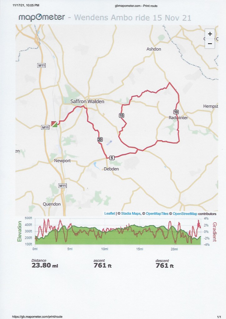 Waving goodbye to Queen-devil Jenni in Saffron Walden, the remaining five devils headed back to Wendens Ambo where Andrew offered a hell of a good choice of beers but, sadly, the light was going and so Charles and Alan continued on their way back to Chrishall and Great Chishill, clocking up around 35 miles in all – well done, chaps – leaving Simon and Martin to partake of the devil’s brew, i.e. Abbott Ale, in front of a roaring fire.