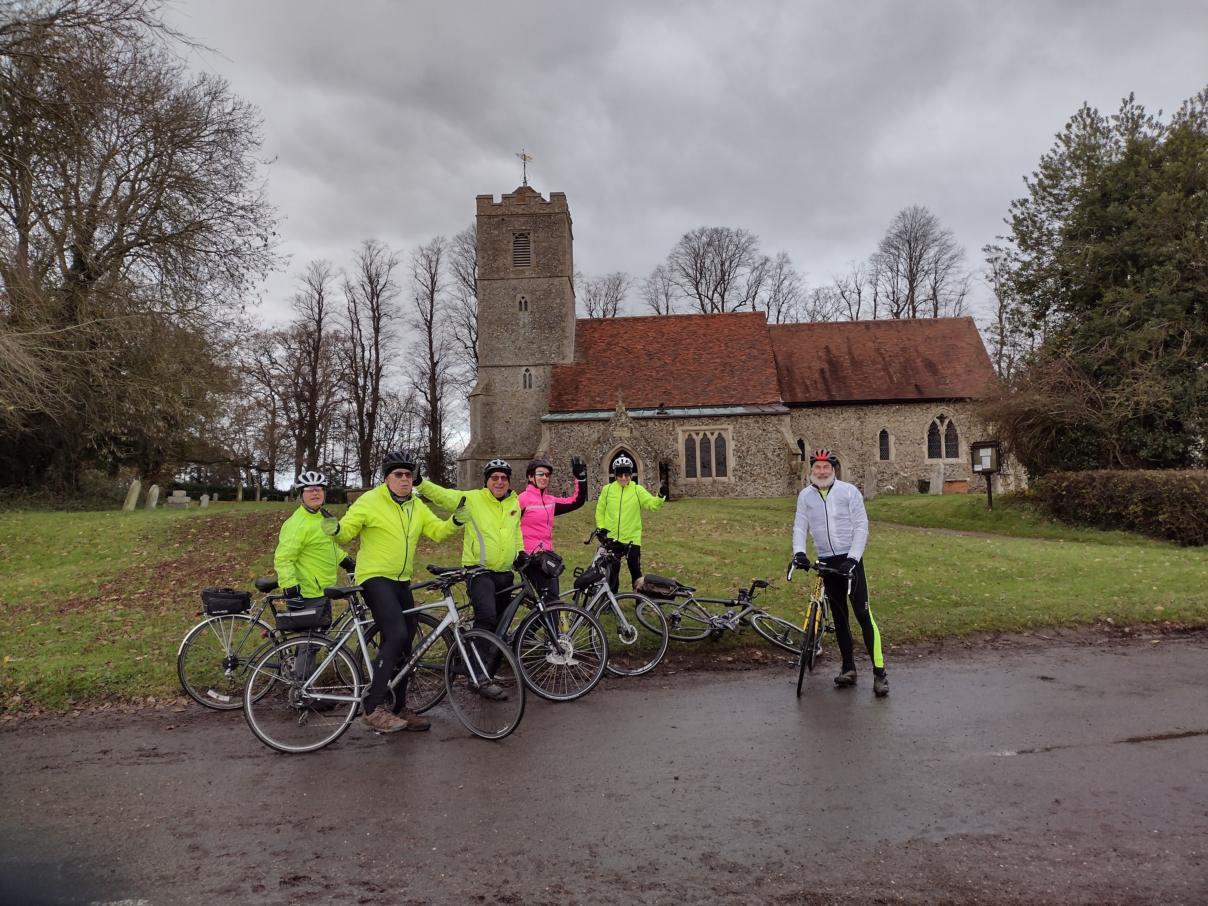Starting from The Black Horse in Brent Pelham for a change, seven Windmillers comprising Maurice, Andrew, Sandra, Nick, Graham, Simon and Martin set off at noon in a clockwise direction to experience copious amounts of winter mud and filthy bikes at the end of the ride. But it was a fairly mild, dry day and so we should be thankful for small mercies, says the Rev.