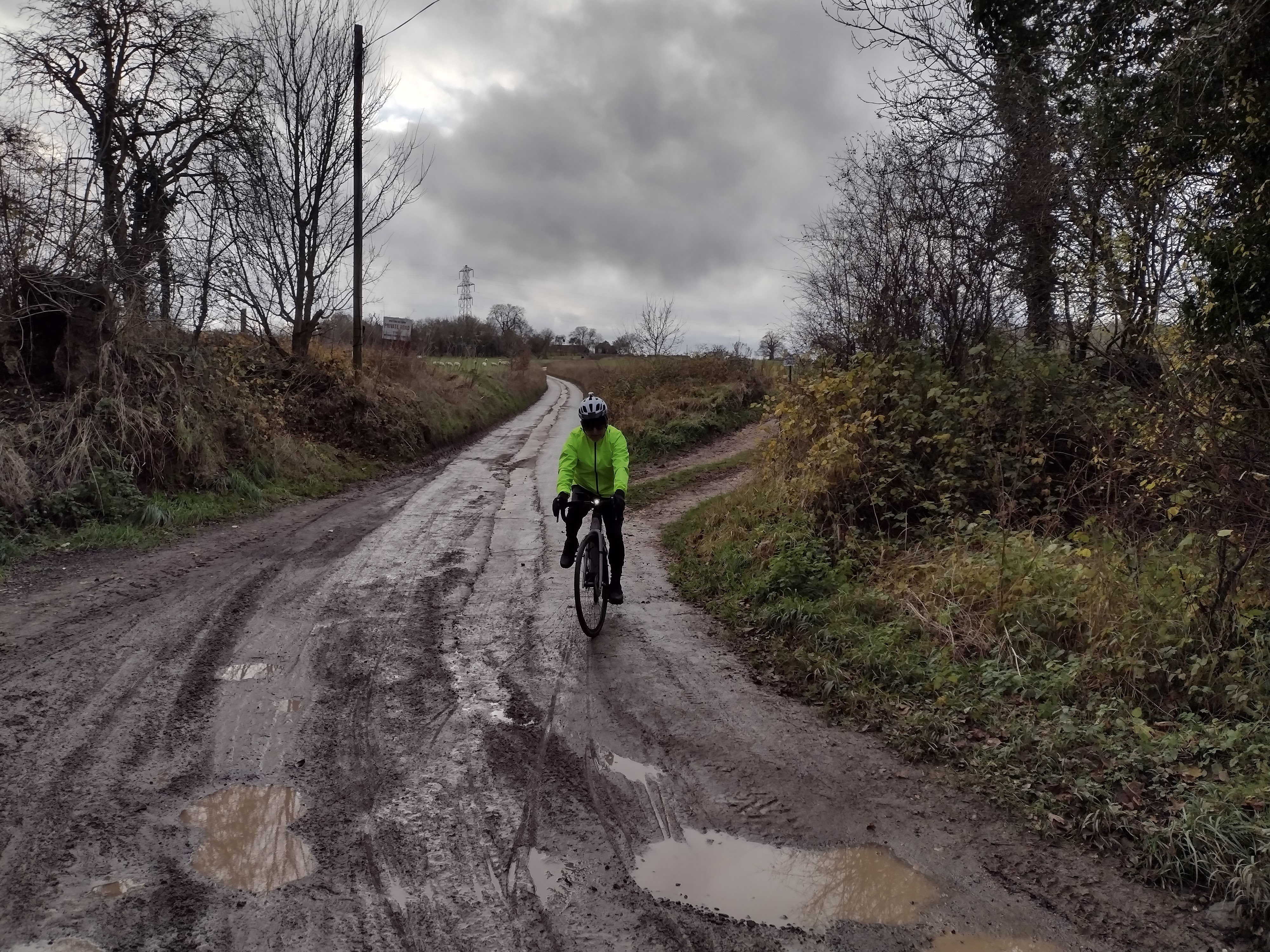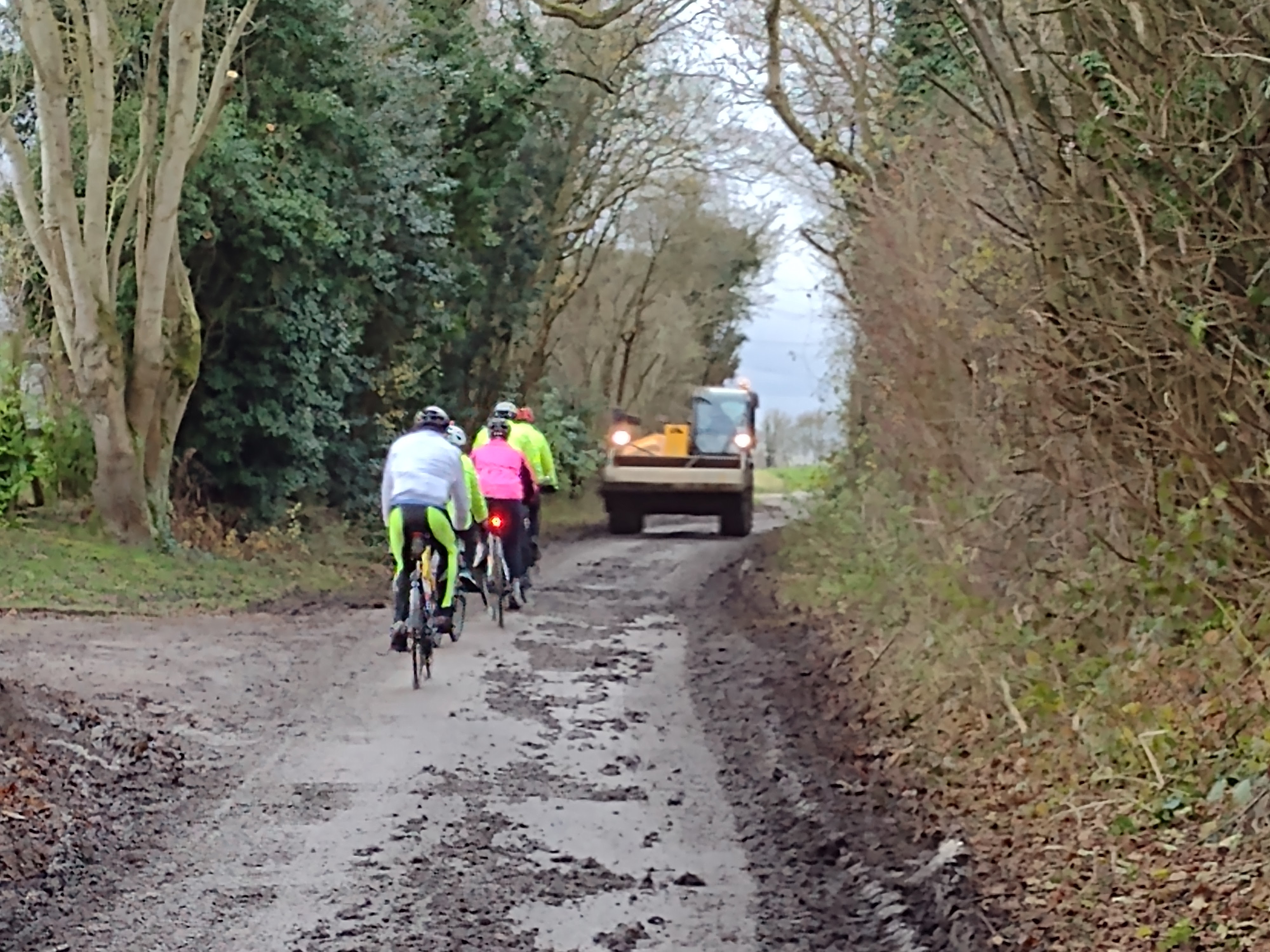 Heading down the steep, bumpy concrete track from Furneux Pelham to Violet’s Lane, the mud at the bottom by the closed road was also thick but passable with care and so we escaped unscathed except for the need to give our bikes a good hosing down.
