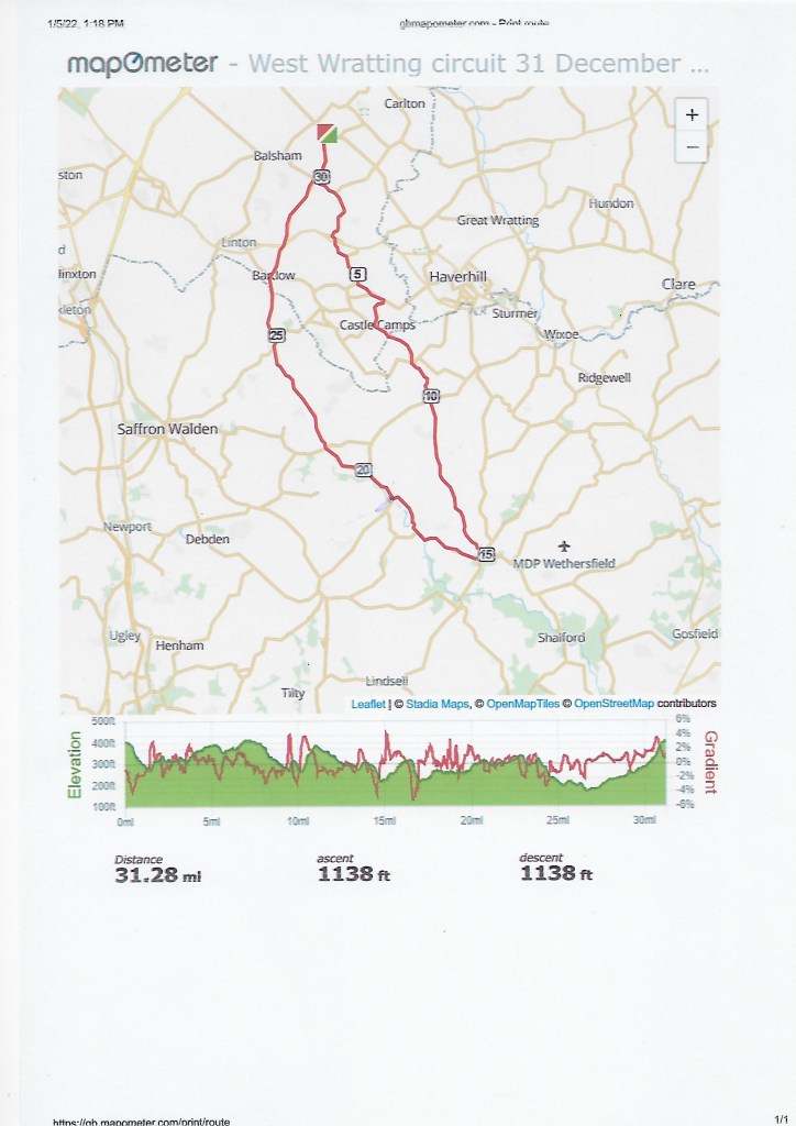 Although pleasantly balmy there was a strong head wind on the outward leg but a blissful tail wind to shunt us up the long climb from Bartlow to West Wratting (the second highest village in Cambridgeshire at the giddy height of 120m).