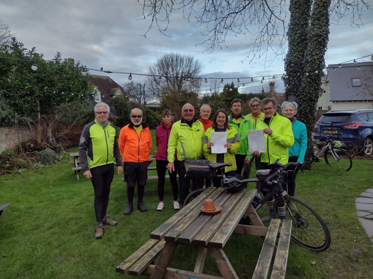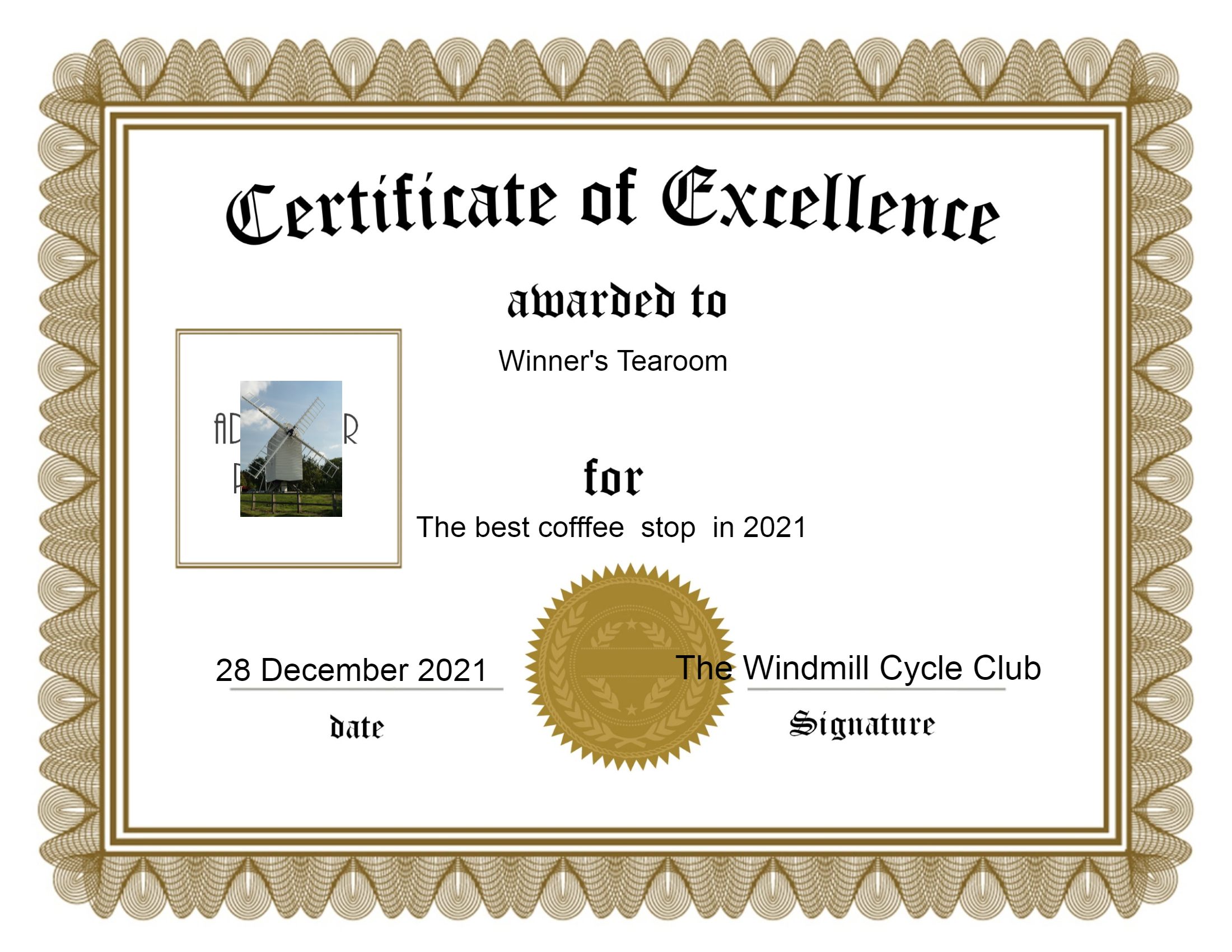 Not only were we starting from our pub of the year but we also stopped at our coffee stop of the year – Winners Tearoom in Finchingfield where, once again, we were given a warm welcome and enjoyed excellent coffee and cakes. This certificate was awarded to them in recognition of the service they provided to hungry and thirsty Windmillers in 2021: