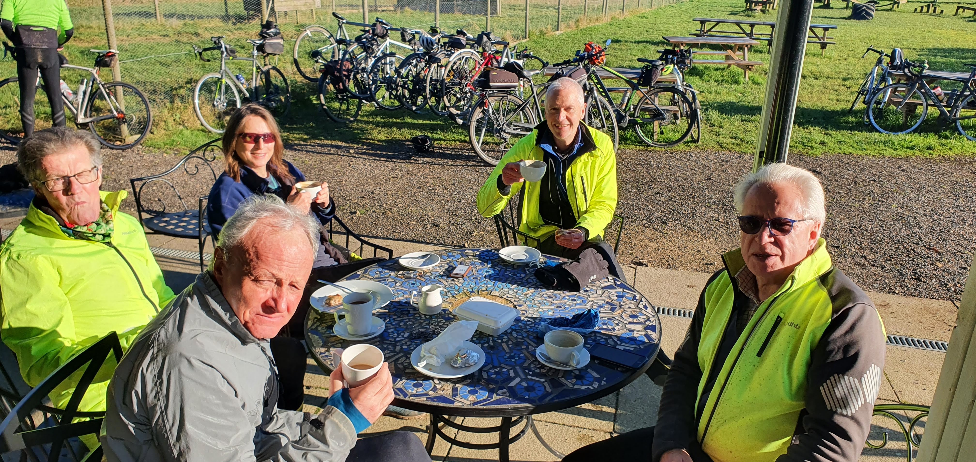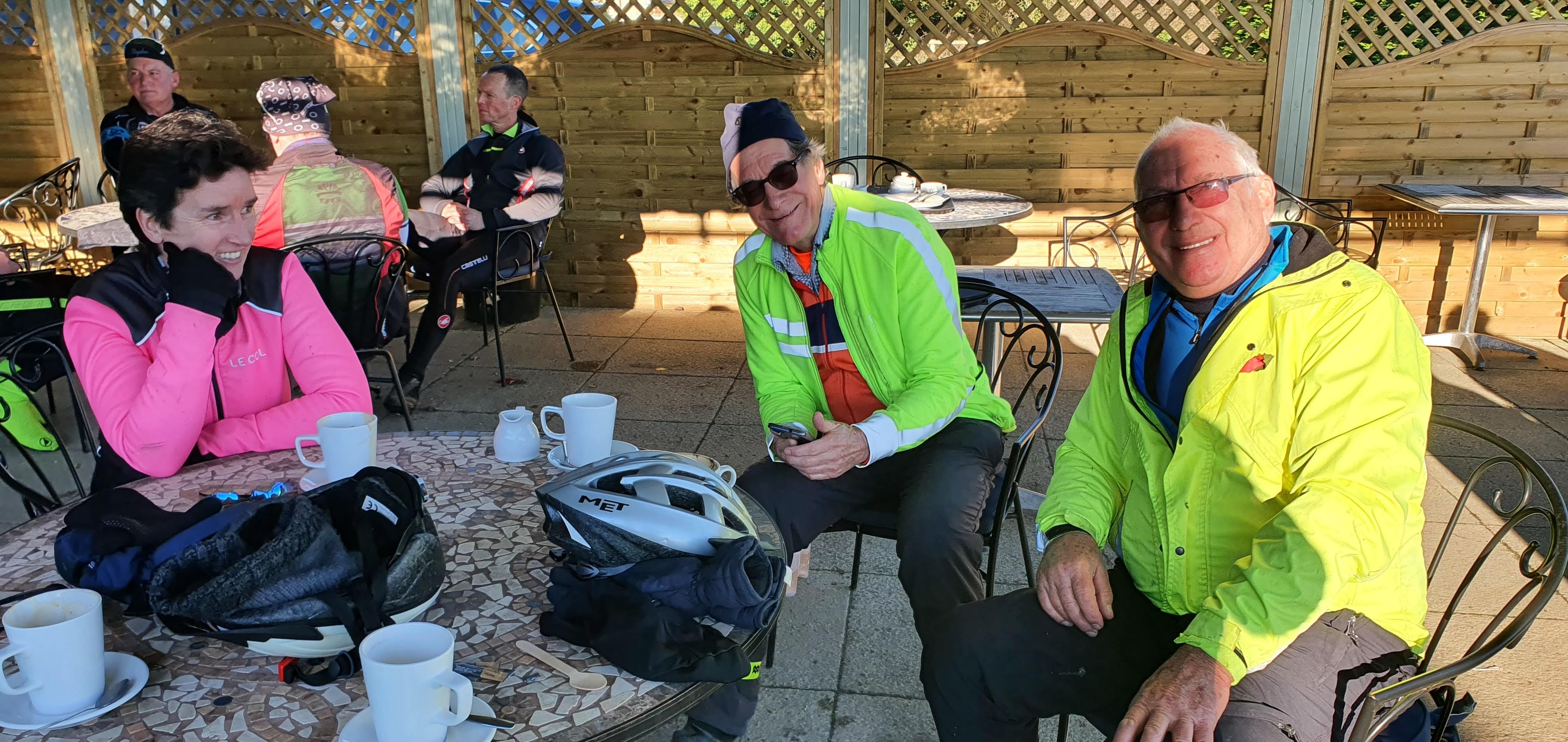 Eighteen miles in, and pulling up at The Blue Egg for refreshments, there was by now sufficient warmth in the sun for us to enjoy our coffee al fresco.