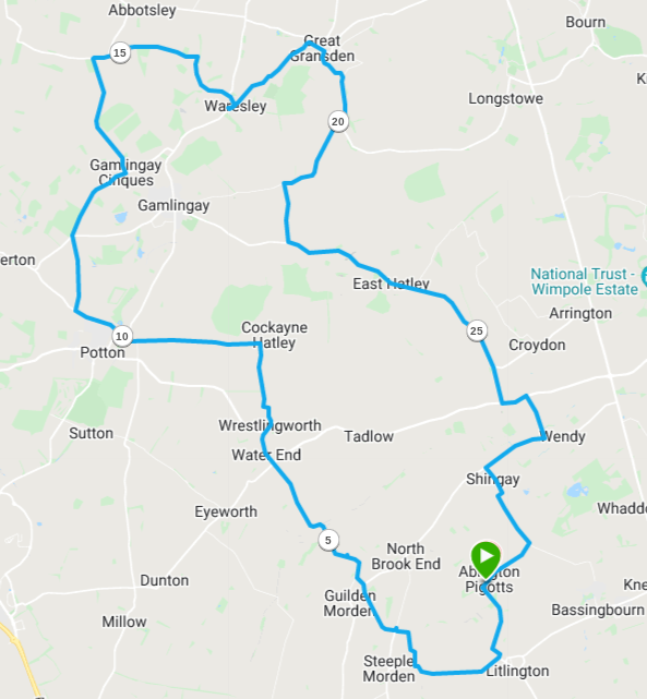 30 miles clockwise: Abington Pigotts, Guilden Morden, Wrestlingworth, Cockayne Hatley, Potton, Waresley, The Gransdens, Hatley St George, Wendy, Shingay, Abington Pigotts