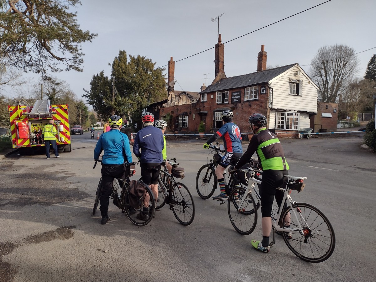 News of the tragic fire which destroyed the Grade 2 listed Axe and Compasses pub in Arkesden began to circulate shortly after 11.45am on 27 March, just before 150 diners were due to celebrate Mother’s Day. Popular with Windmillers, both as a stopping point whilst on a ride and for meals with family and friends, the pub will be sorely missed by many people. The moussaka was legendary – how far do we have to go now to enjoy such good minced lamb, aubergines and tomatoes with a cheese sauce on top?