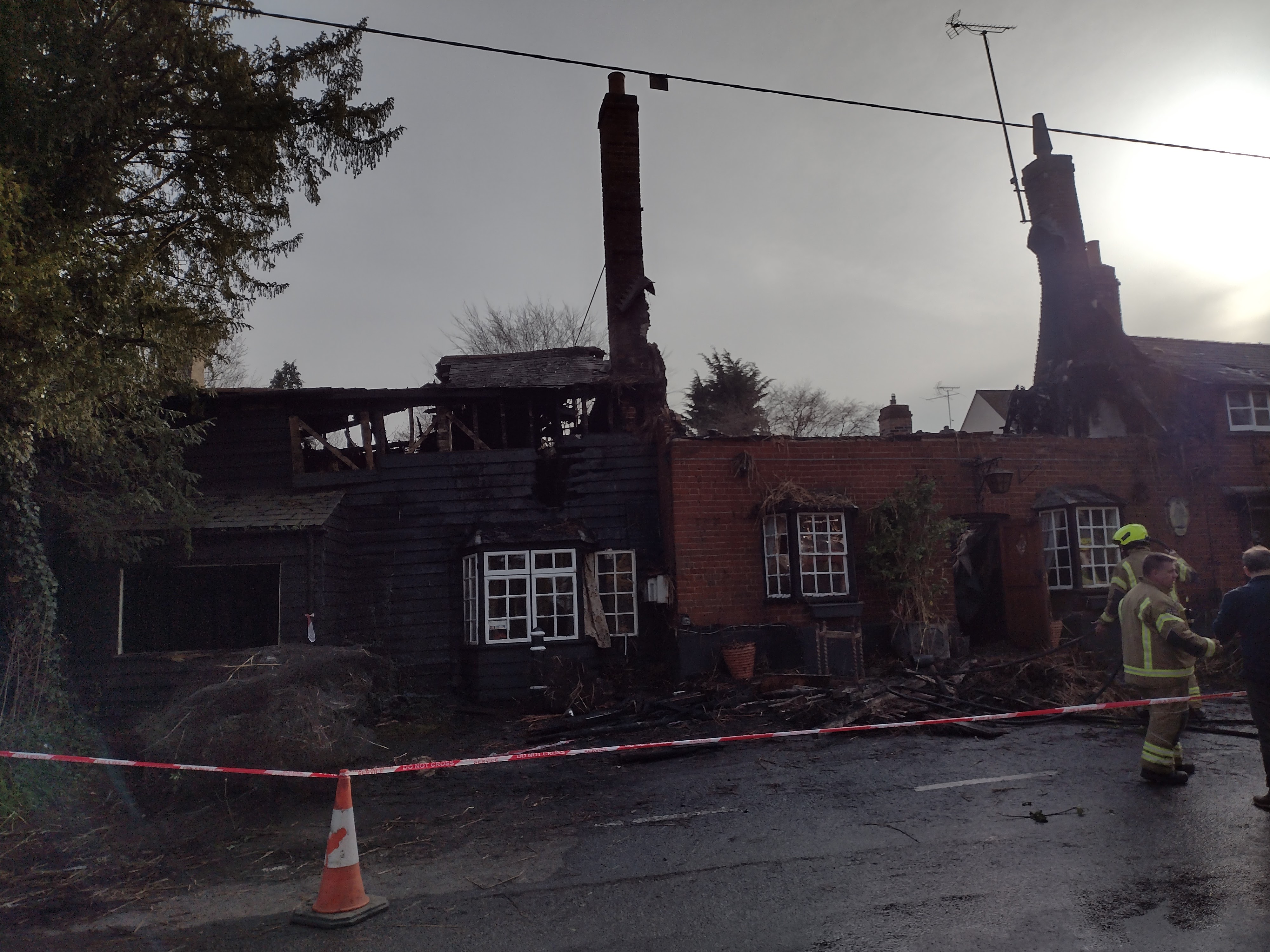 Ten fire engines arrived from Saffron Walden, Newport and Stansted to tackle the blaze but were unable to save the building due to the rapid spread of the fire through a thatched roof. Only part of the building remained, on the right hand side, but this was severely damaged by water penetration. Our sympathies go to the Christou family who have run the pub for over 30 years, dishing up several tons of moussaka during that time.