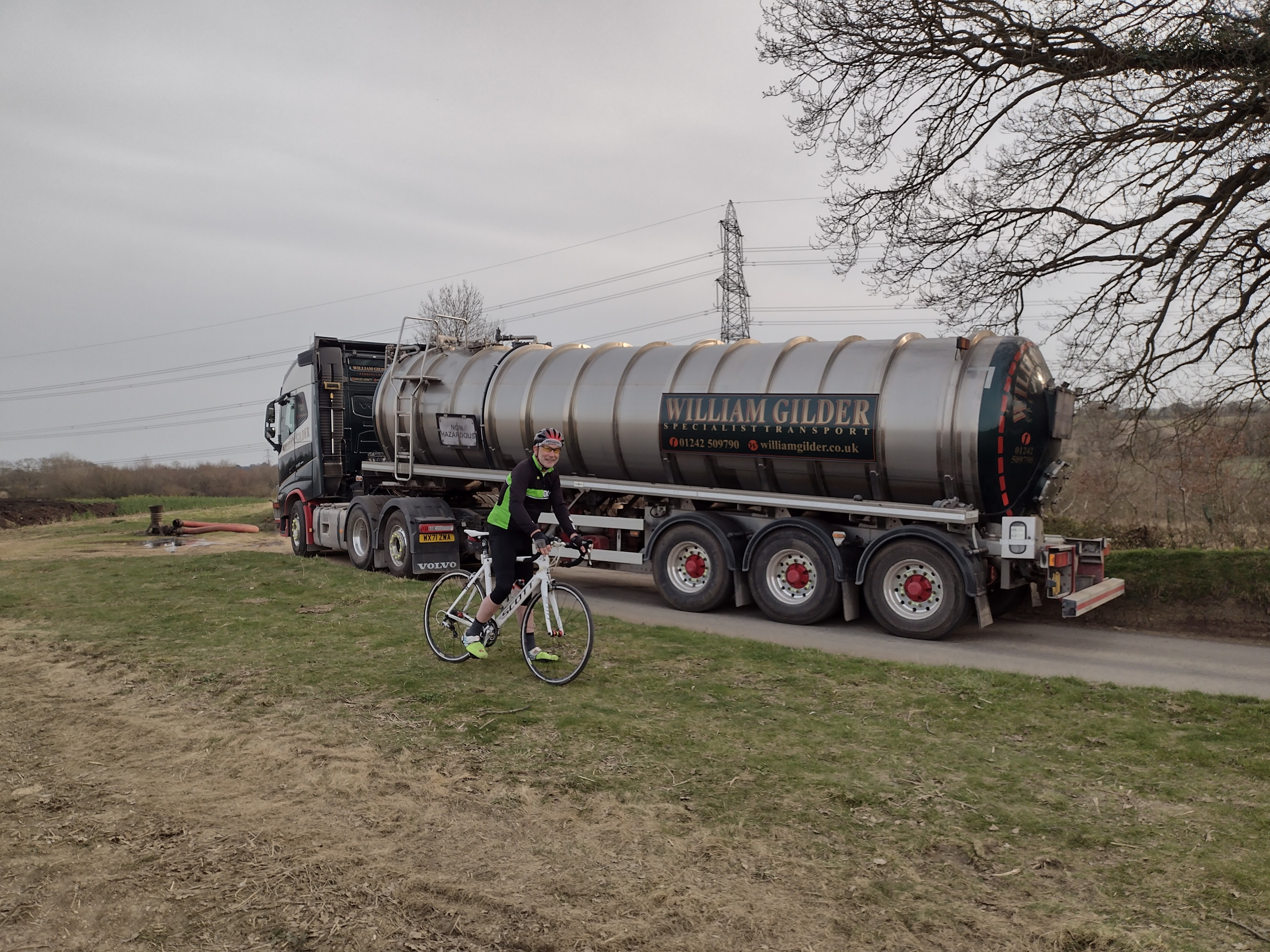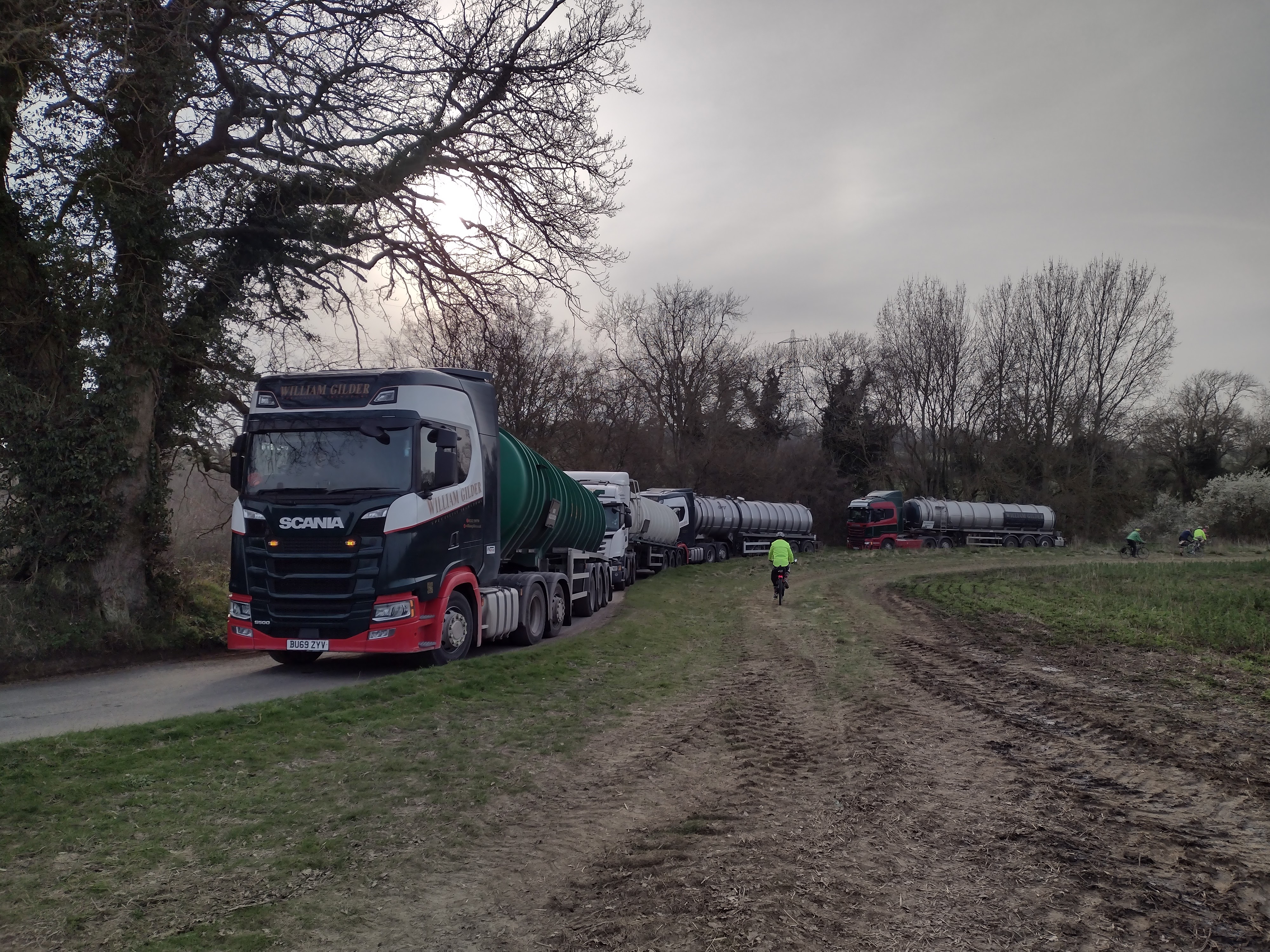 Moving on through Clavering and Starlings Green it wasn’t long before we took a left down Violets Lane and through the remains of some thick mud before heading towards Brent Pelham, only to find our path blocked by a huge sludge lorry attempting to head towards us. Quite how he was planning to attempt the corner at Violets Lane, we didn’t stop to enquire but we managed to just squeeze past. All became clear when we then came across what must be a record jam of sludge lorries in Hertfordshire – not just one but seven in total!