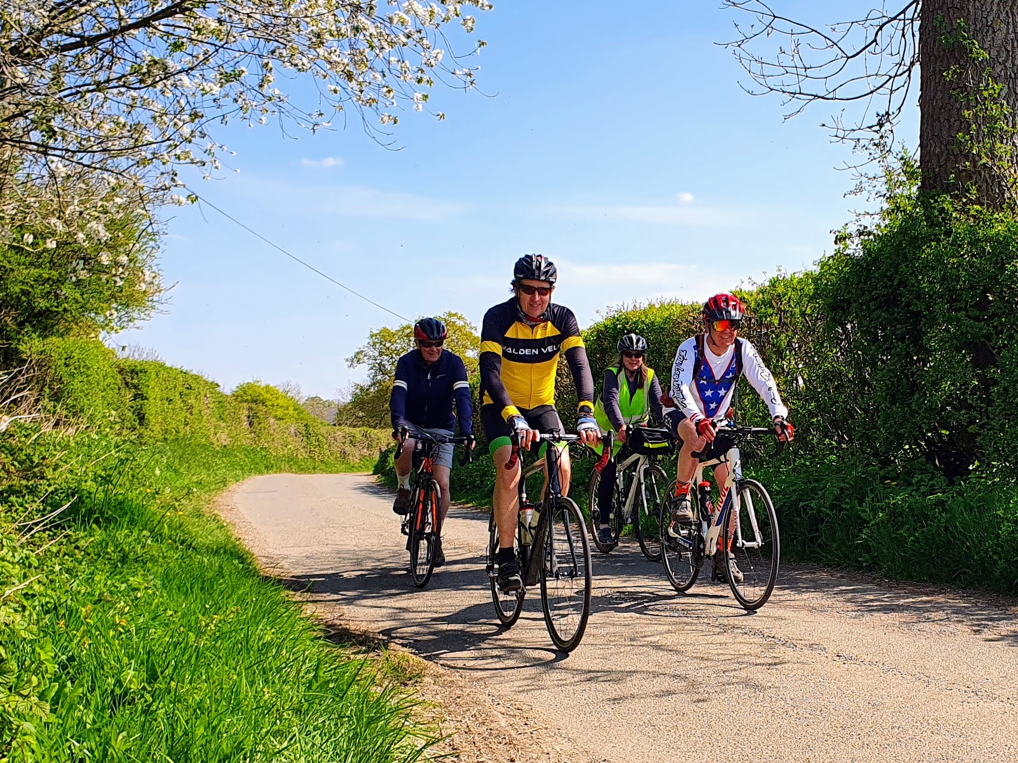 It is 11 years since The Windmill Club was established and we still have the dedicated support of founder Maurice, seen zooming onwards at a rate of knots in the photo above on this Birthday ride, and deputy-Dawg Andrew, who decided a rest was needed to smell the bluebells in woods near Nuthampstead. We are indeed very fortunate to have all the hard work taken away from us in terms of ride planning and organisation by those two stalwarts. Helmets off to both of them.