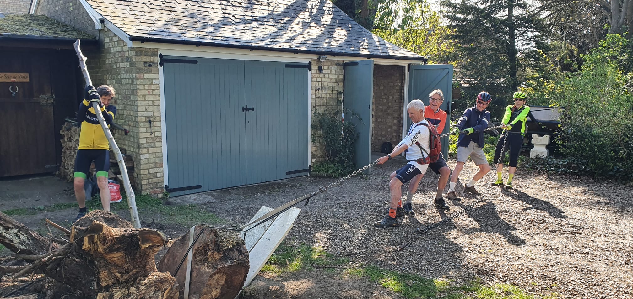 Those starting at The Red Cow were Maurice, Andrew, Geoff, Charles, Simon, Graham, Ric, Roger, Alan and Chris whilst those starting in Ickleton – Ken, Brian, Howard, Tom, Jeremy and Martin were put to work before setting off attempting to heave out the rest of Martin’s stubborn walnut tree stump, but to no avail despite Howard’s idea that a bit of leverage might help.