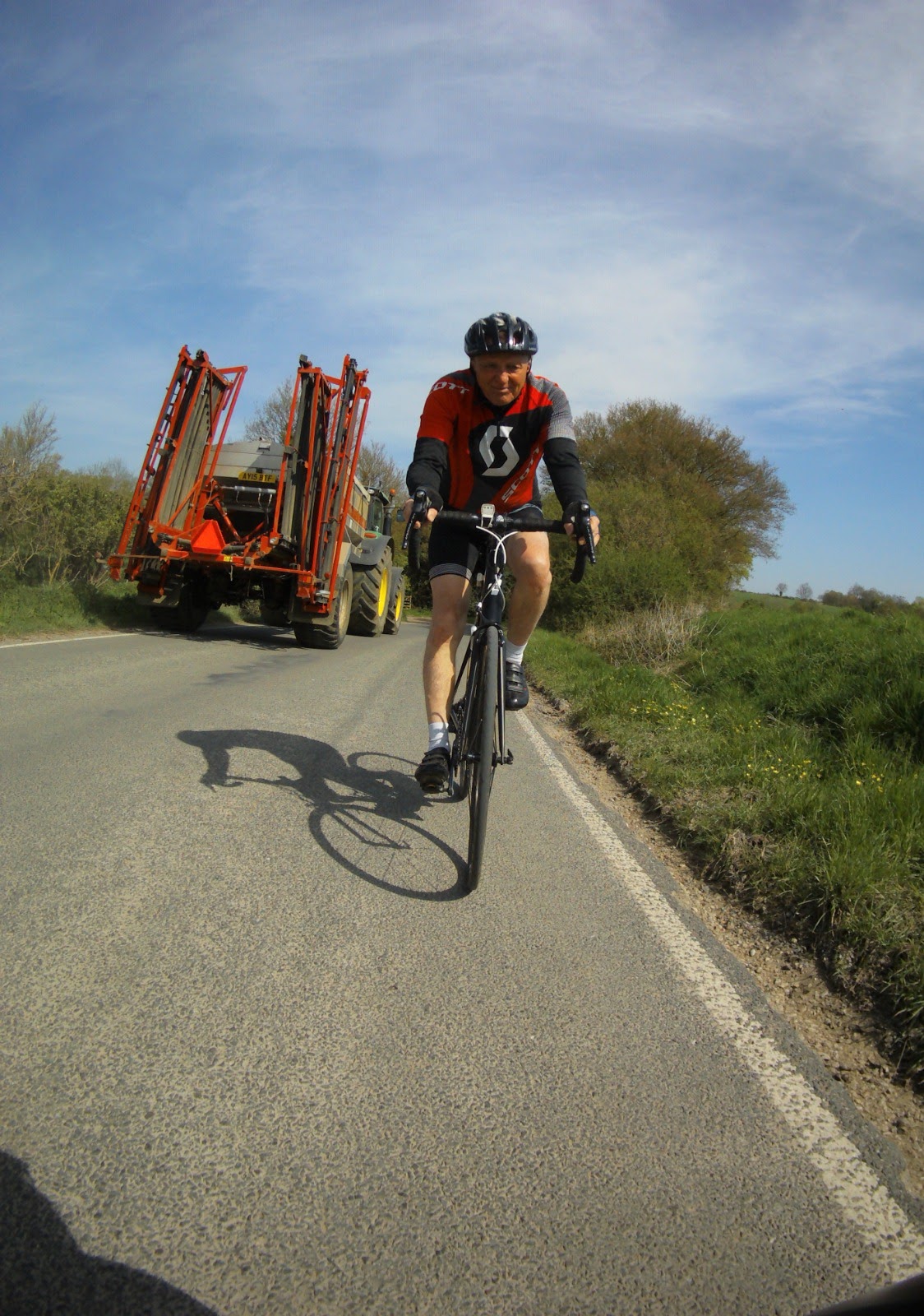 Having given up on the tree stump the Ickleton mob set off a bit earlier than expected and cruised up Coploe Hill with the wind behind to meet up with Ken who had made an earlier start. This meant that we were ahead of Maurice’s group and Andrew’s group and would be first in line for the coffee at Poppy’s Barn. Yippee! Little did we know what was going on behind us……… but Alan has very kindly supplied the details: