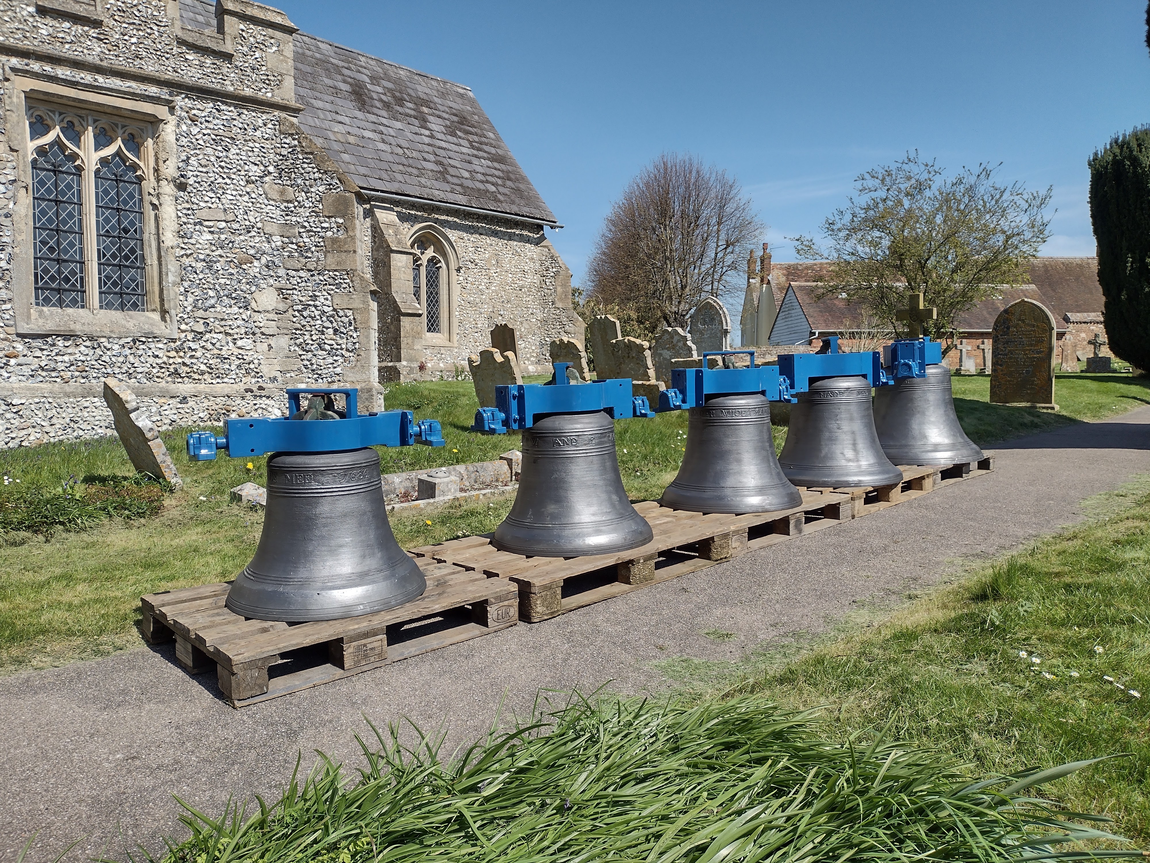 Entering Great Chishill, a once-in-a-lifetime event was taking place when a fork lift truck was seen carrying a recently cast bell towards the church entrance. But that was not all – the five original bells, four dating back to 1686 and the fifth made in 1841 – had all been renovated and delivered back the same morning, looking very smart on the path to the church door.