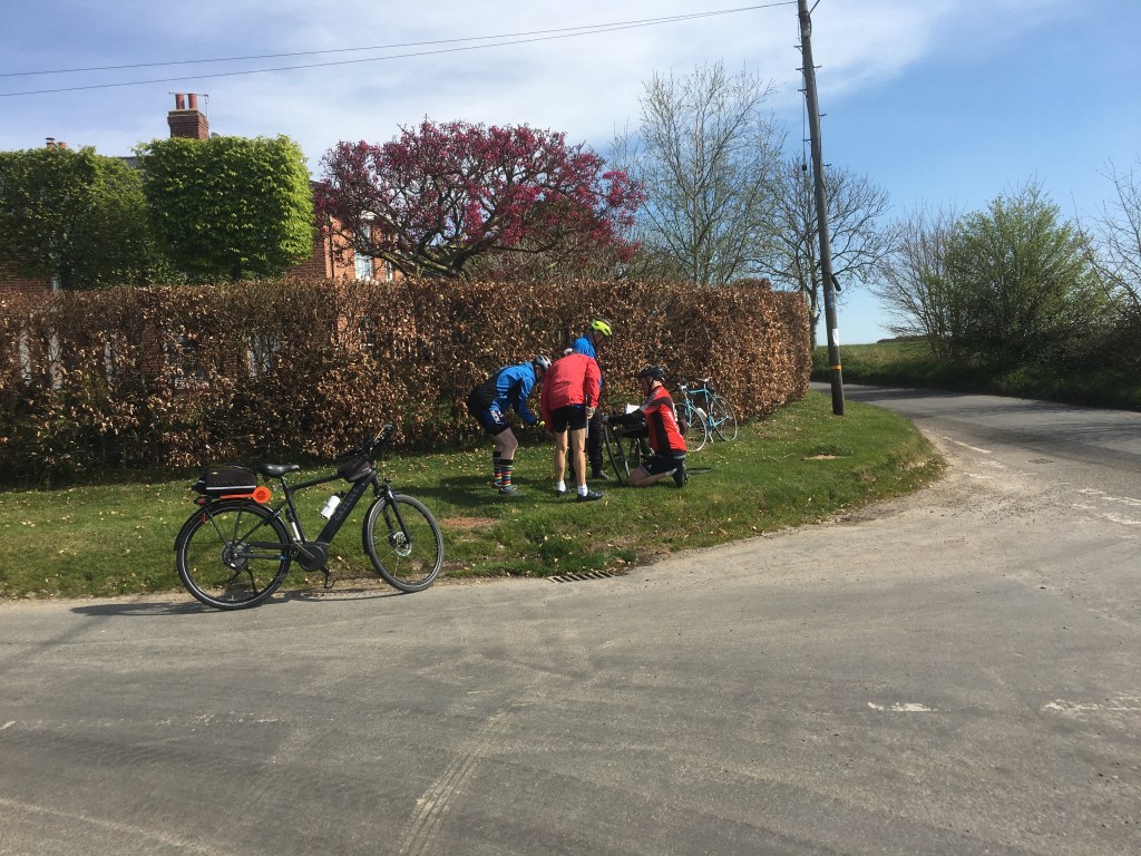 The hole was soon identified, patched tyre and wheel fitted on we were on our way. The repair had taken over 15 minutes somewhat longer than the club record of just over 4 minutes.