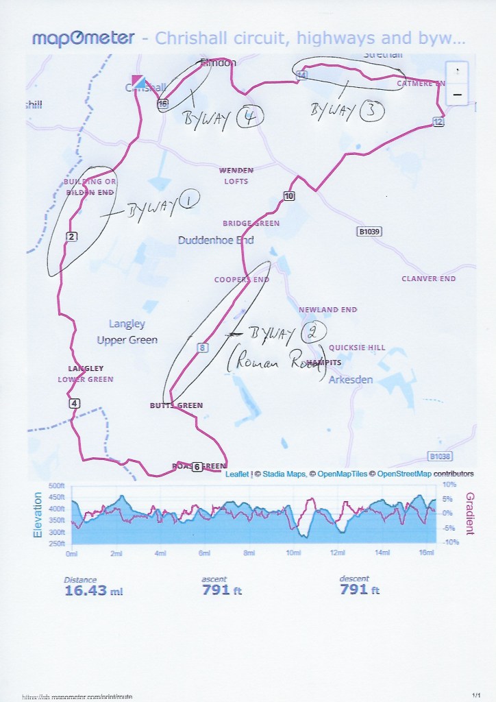 Finally, Byway no. 4 was meant to take us directly from Elmdon to Chrishall, which it did for Rod who was out front with hearing aids turned off / not working, but the remaining group decided to take Graham’s detour to the north end of Chrishall through the infamous ‘big dipper’ and soft gravel – all because Martin reported a tree down on the intended route which Charles had promised to chain-saw away before heading off on his sailing trip. But he hadn’t – the tree was still there but Rod managed to get his e-bike around it somehow and got back to The Red Cow long before the others.