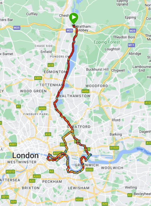 Revived by beer and pub nosh, we set off and wound our way through the historic lanes of Wapping and Shadwell to Limehouse Basin. From here we were waterside all the way back, along the Regent’s Canal, Hertford Union Canal and the final 12 miles back up the Lee Valley.