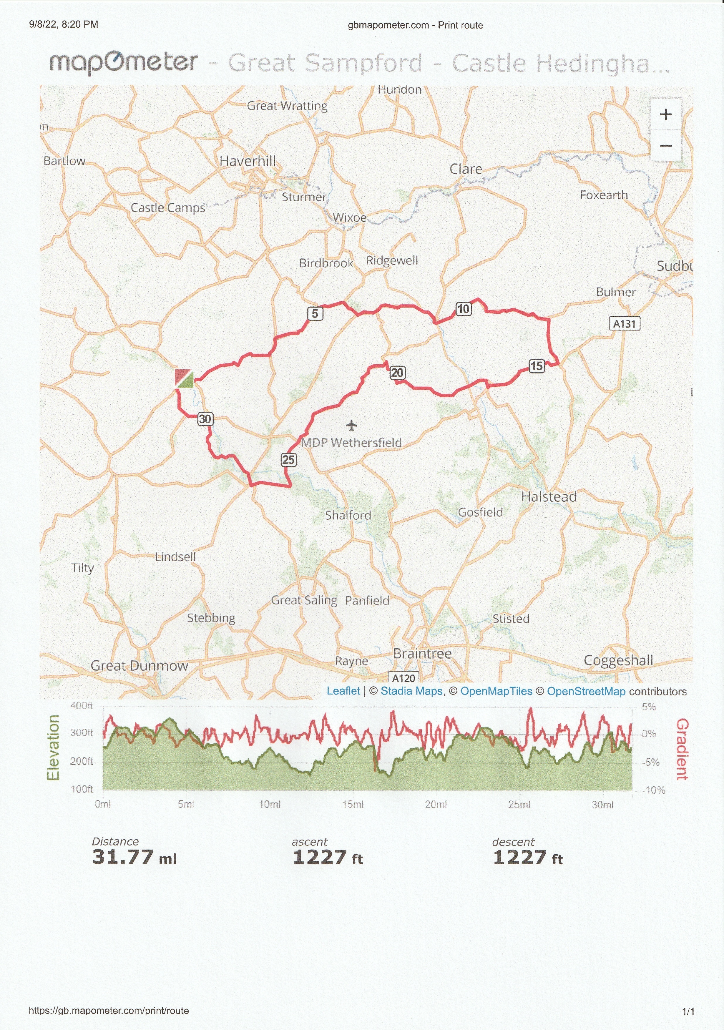 Setting off on the return leg took us on a different, longer route than used before which took us though some lovely quiet lanes with steep hills in places, winding bends and what could easily be a deep ford in winter months. Emerging once again in Great Bardfield but then taking another different route to the road leading back to Great Sampford, we eventually arrived back at The Red Lion bang on time for lunch at 1.10pm to find Maurice waiting for us.