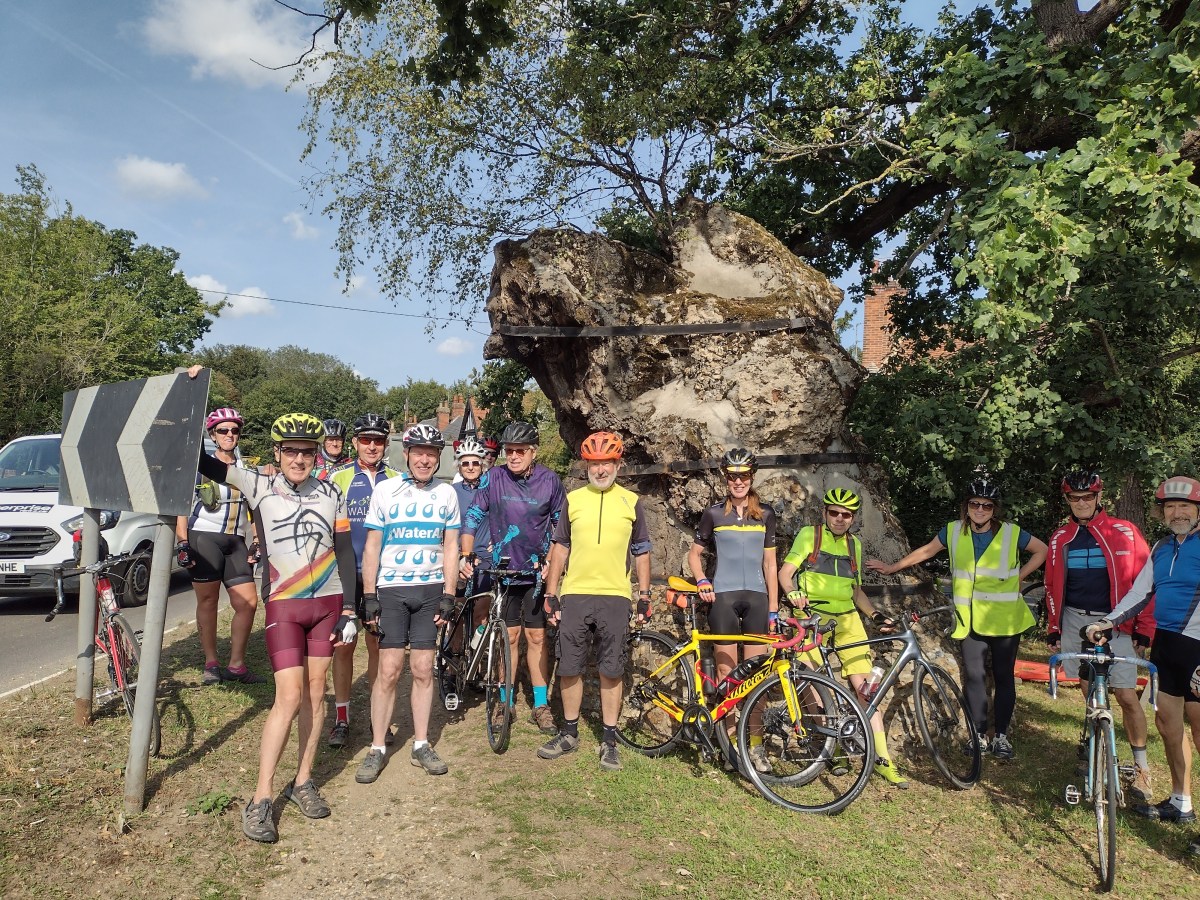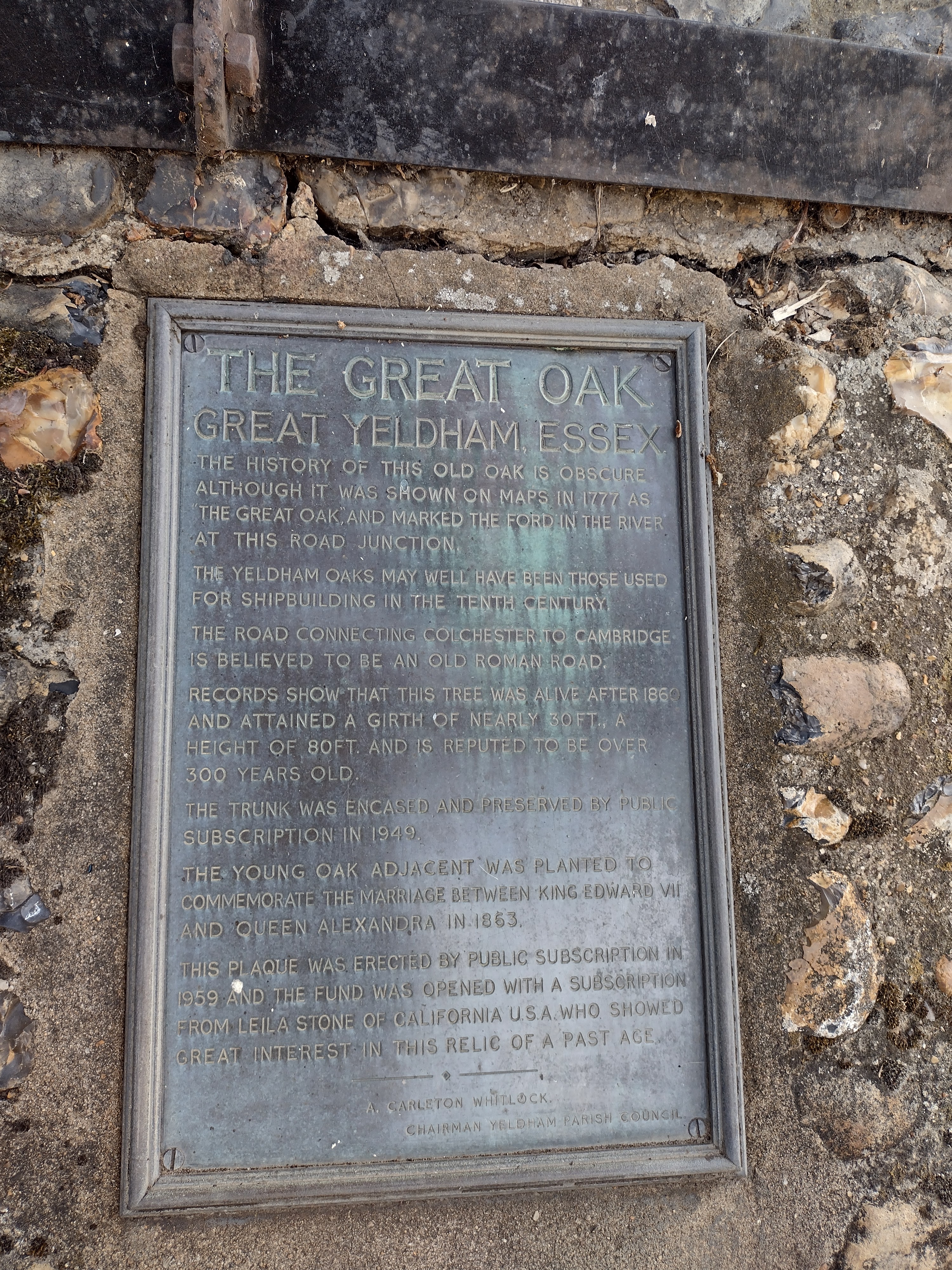 So, with lunch all sorted, the first group of eight led by Geoff set off at 9.30 towards Castle Hedingham using the reverse of the route used previously but it wasn’t long before the second group overtook them whilst Deborah’s saddle was being adjusted by Graham. And it more or less stayed that way until a stop was made by everyone in Great Yeldham to admire the remains of an ancient oak tree (as above) held together with metal straps and concrete – dead as a dodo it seems but a nice reminder all the same of what was clearly a massive tree, assisted perhaps by being next to a ford on the Cambridge – Colchester road. Here is the plaque which gives the full history: