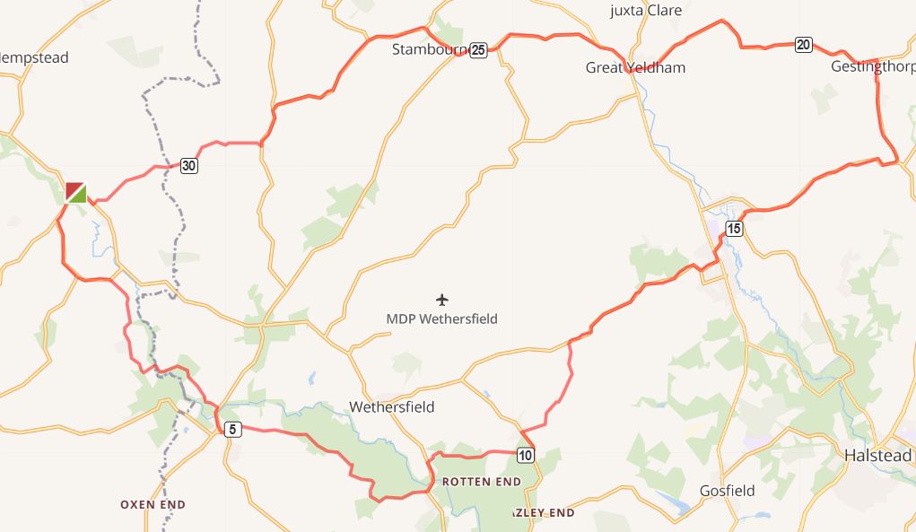 This Thursday saw a beautiful ride from one of our favourite restaurants, The Red Lion at Great Sampford, anticlockwise round this course via Castle Hedingham and back. It was completed by eleven riders.