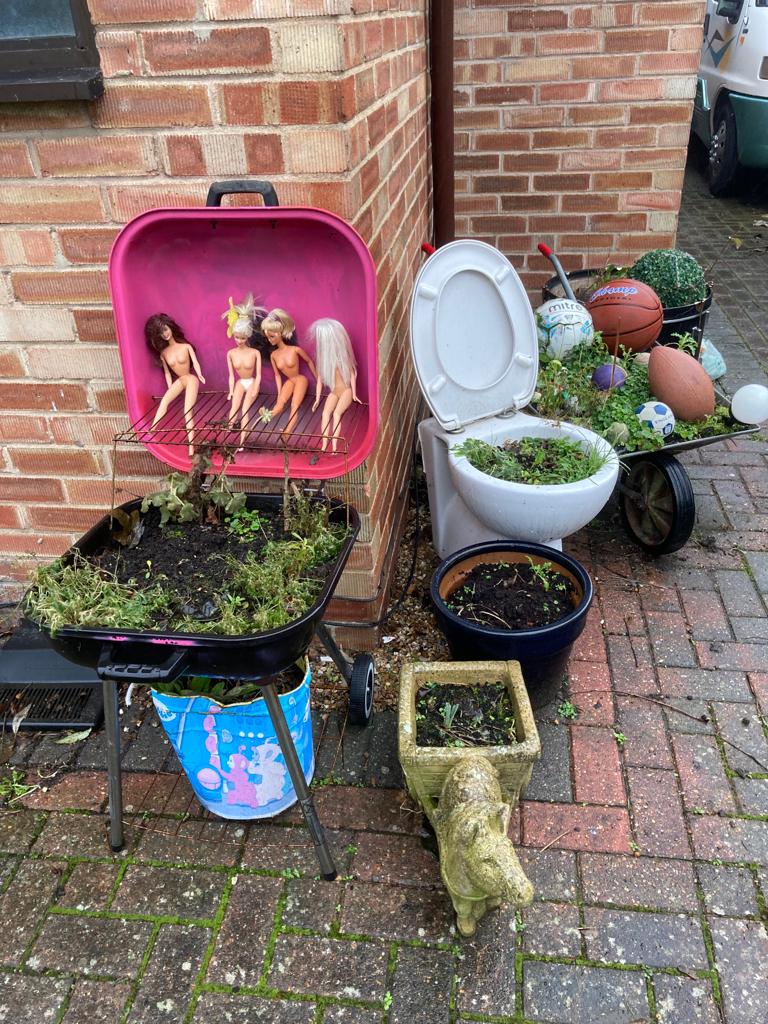 We hadn’t reckoned on the friendly house owner with his collection of burst football plant pots and other pieces of garden art which he insisted on showing us at length.