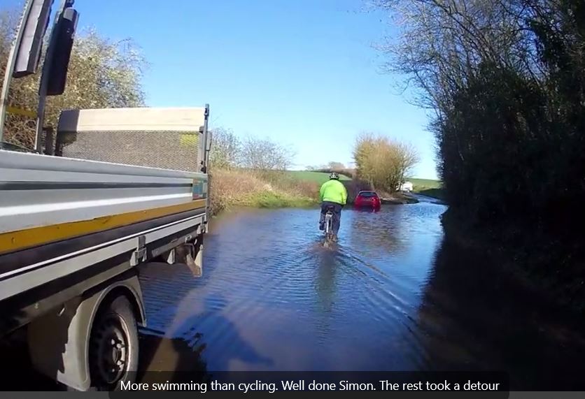 This one though was different. Some clues were present which I should have noticed. There were workmen, yes real people actually doing things, with white vans, road signs and stuff. There was a red car ‘not waving but drowning’ as Stevie Smith would have it. And really I should have stopped. I should have thought about club members with big electric batteries on their bikes. I should have turned back when the water got deeper and deeper.